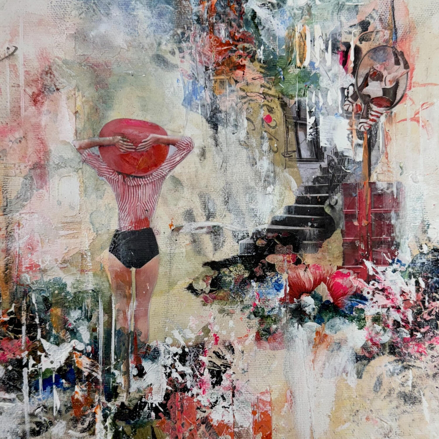 L'artiste a utilisé les techniques mixtes: peinture acrylique, textures, papiers, collage, et autres médiums afin de créer cette peinture grand format sur canevas de style semi-abstrait surréaliste.