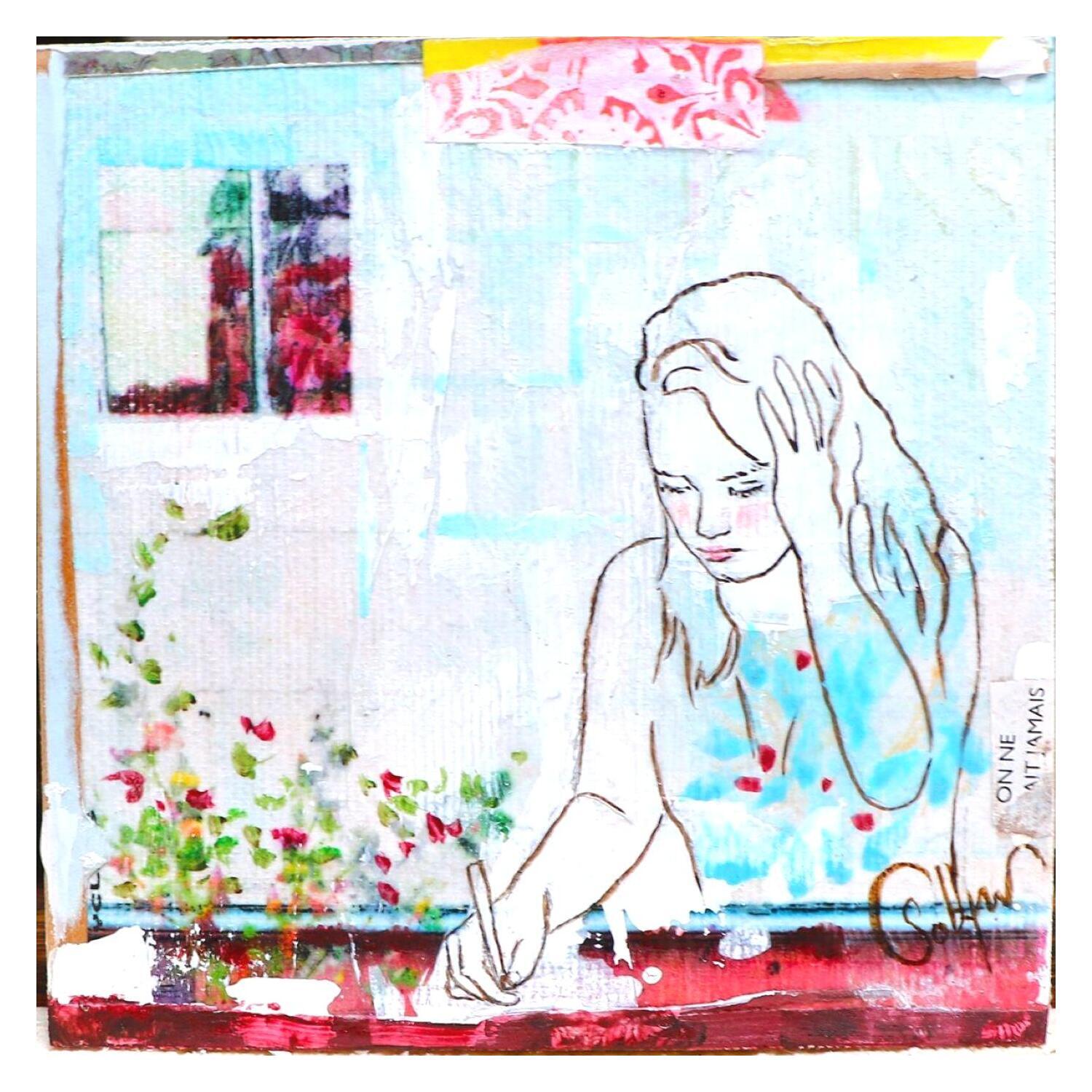 L'artiste a utilisé la technique mixte, Encre, Acrylique, upcycling, photo, collage, estampage pour créer cette peinture petit format toile sur Bois de style Art Singulier.