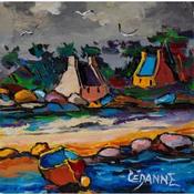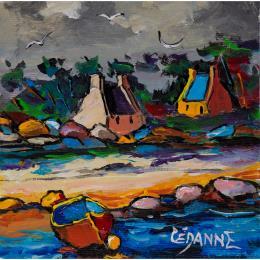 Cette œuvre d'art contemporain unique et originale, de style figuratif, a été réalisée par le peintre Cèdanne. L'artiste a utilisé différentes techniques pour créer cette peinture petit format, et traiter avec le style singulier qui lui est propre, cette vue d'un coin de Bretagne à marée basse.