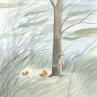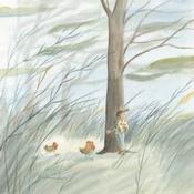 Peinture la fillette et les deux poulettes par Marjoline Fleur | Tableau Figuratif Nature Animaux Enfant Aquarelle