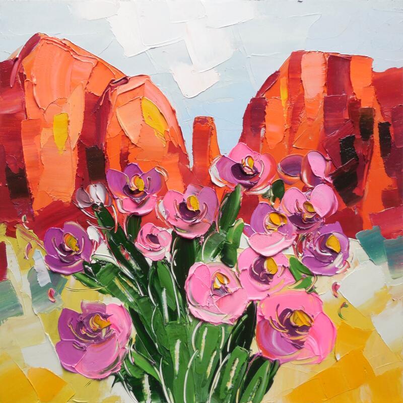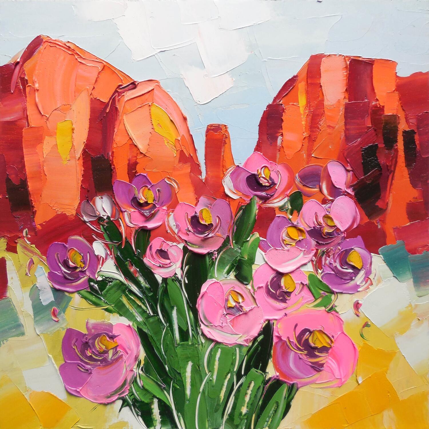 Cette œuvre d'art contemporaine unique et originale intitulée « Fleurs de cholla roses » a été créée par l'artiste contemporaine Lunetskaya Elena. L'artiste a utilisé de la peinture à l'huile sur toile pour créer ce petit tableau figuratif.