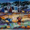 Cette oeuvre d'art contemporain unique et originale "Maisons bretonnes et barques rouge et bleue" a été réalisée par l'artiste contemporain Cédanne.