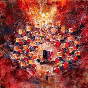 Le concert avec pianiste est une œuvre qui oscille entre abstraction dans la périphérie et art naïf dans le centre et la représentation des instrumentistes. Le motif est peint au couteau et à l'huile et joue sur sur une harmonie de couleurs chaudes (nuances de rouge, orange) et métalliques (or, cuivre, et argent...). Les têtes carrés des personnages s'inspirent de la série "Parc des Princes" de Nicolas de Staël. La mise en scène met en valeur le pianiste central et joue sur la circularité (la formation) et la verticalité (le fond). Le chef, isolé et dans une posture magistrale, conclut la partie basse de l’œuvre. L'ensemble présente une tonalité dite flamboyante ou baroque... selon les sensibilités