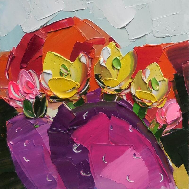 Cette œuvre d'art contemporaine unique et originale, intitulée « Opuntia Santa Rita », a été créée par l'artiste contemporaine Lunetskaya Elena. L'artiste a utilisé de la peinture à l'huile sur toile pour créer ce petit tableau figuratif.