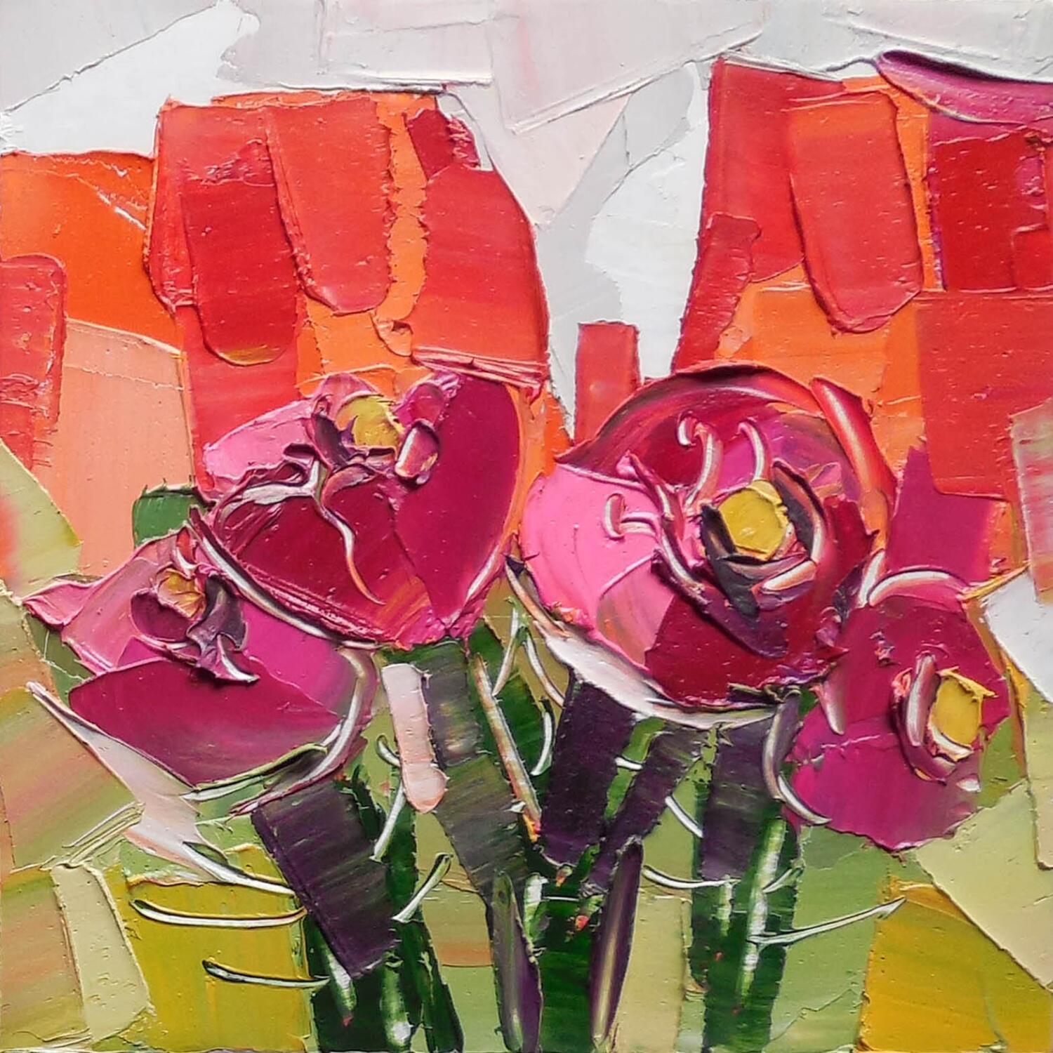 Cette œuvre d'art contemporaine unique et originale intitulée « Fleurs de cholla roses » a été créée par l'artiste contemporaine Lunetskaya Elena. L'artiste a utilisé de la peinture à l'huile sur toile pour créer ce petit tableau figuratif.
