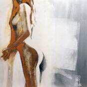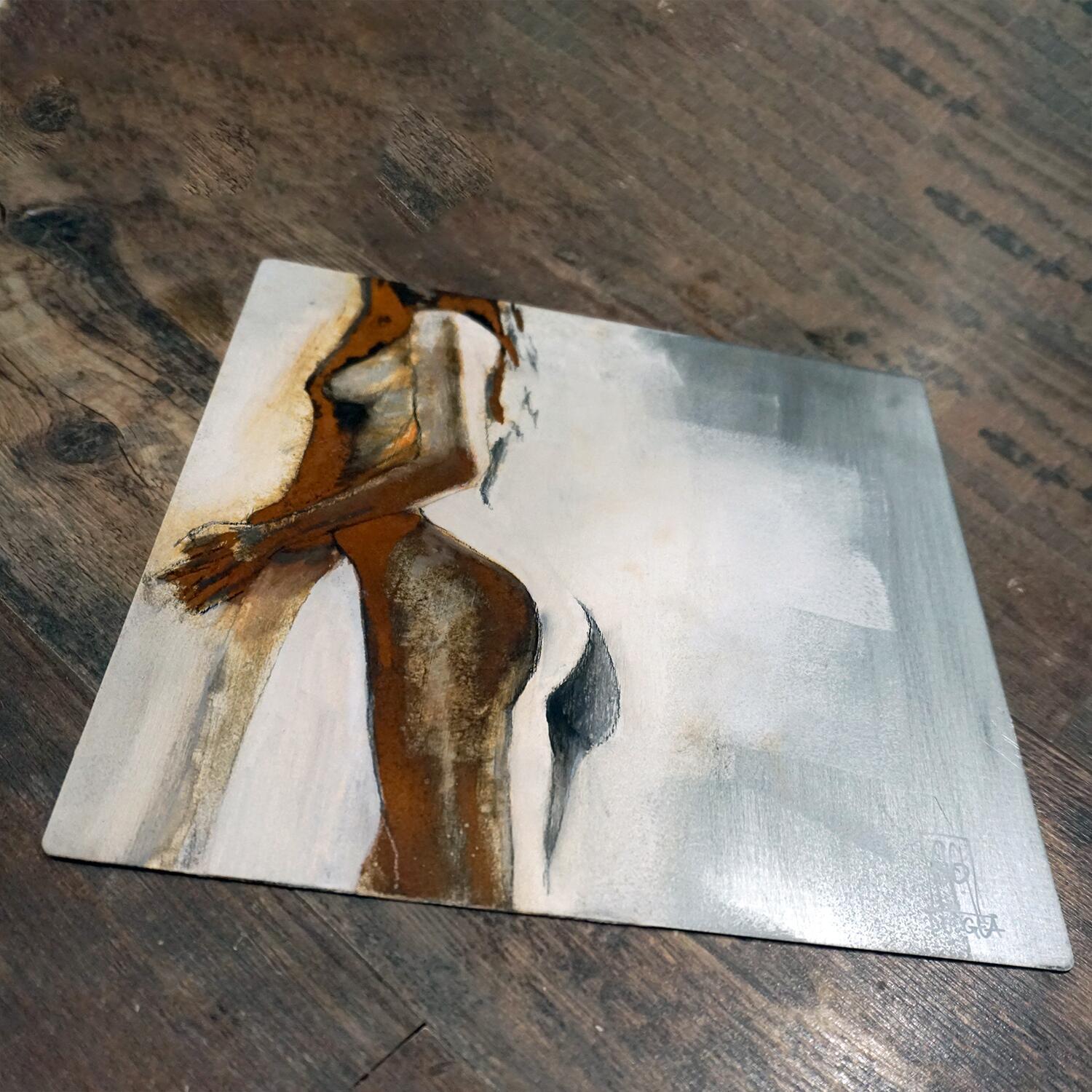 L'artiste a utilisé une technique unique, basée sur l'utilisation de l'oxydation du fer, c'est à dire la rouille, pour créer cette peinture petit format au style singulier.