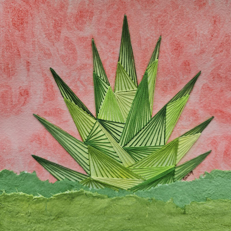 L'artiste a utilisé la broderie, l'aquarelle et le collage pour créer cette petite peinture thématique.