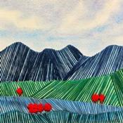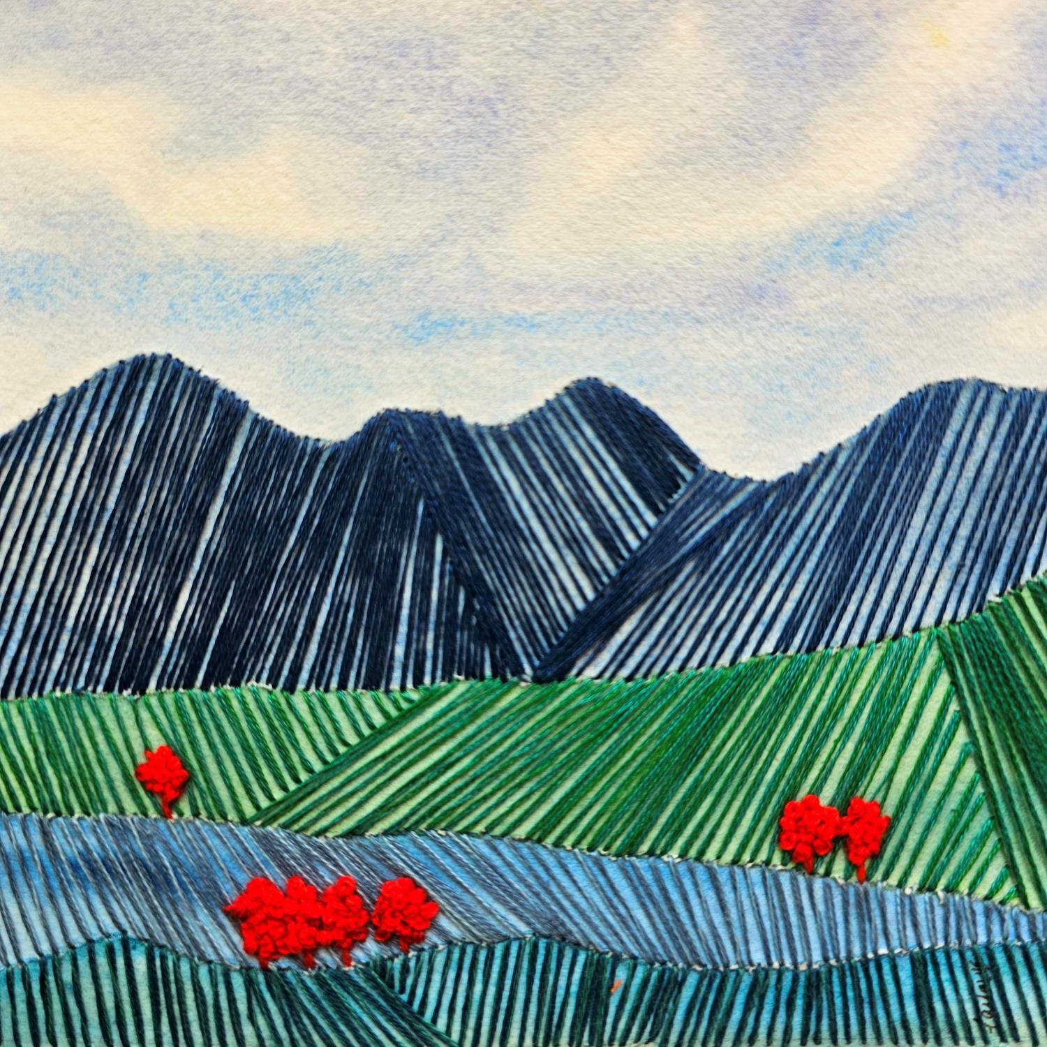 L'artiste a utilisé la broderie et l'aquarelle sur papier pour créer ce sujet, peinture de petite taille.