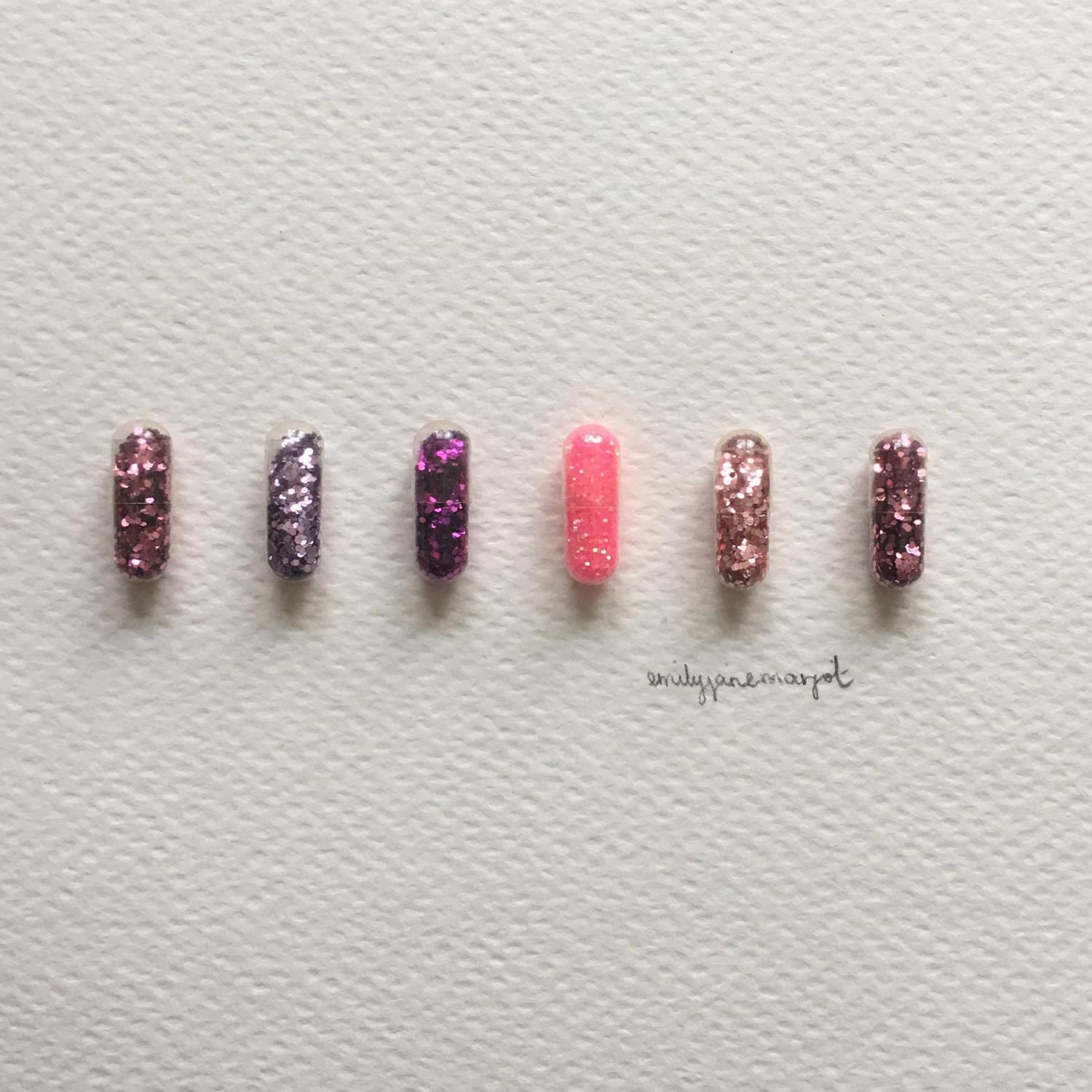 Cette oeuvre d'art contemporain unique et originale "Happy pills pink" a été réalisée par l'artiste contemporain Marjot Emily Jane .