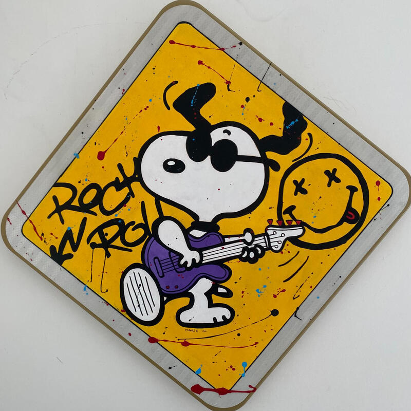 L'artiste a utilisé de l'Acrylique pour créer cette peinture grand format sur un panneau de signalisation de style Pop-art sur le thème Icones Pop.