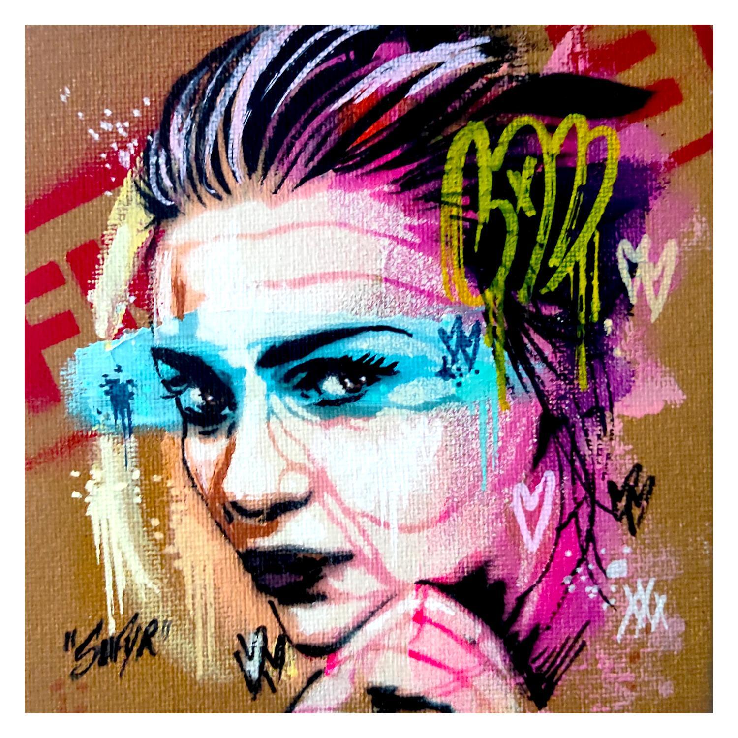 L'artiste a utilisé les techniques Graffiti, Acrylique pour créer cette peinture petit format de style Street Art sur le thème Portraits.