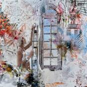 L'artiste a utilisé les techniques mixte et la peinture acrylique: Collages, textures, papiers, pastels et autre médiums pour créer cette peinture petit format sur toile de style semi-abstrait.