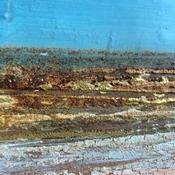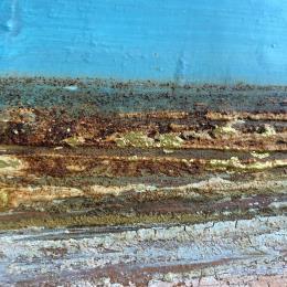 Travailleuse acharnée et passionnée, elle nous entraîne à travers ses mélanges de pigments dans un monde minéral et brut. Ses couleurs métalliques, dorées, cuivrées, rouillées, s’organisent dans un rendu fissuré, craquelé et accidenté, rempli de délicatesse, de poésie et de sérénité.