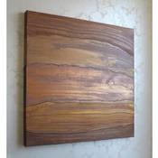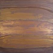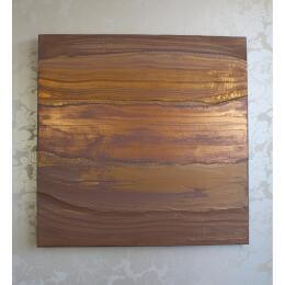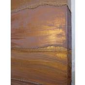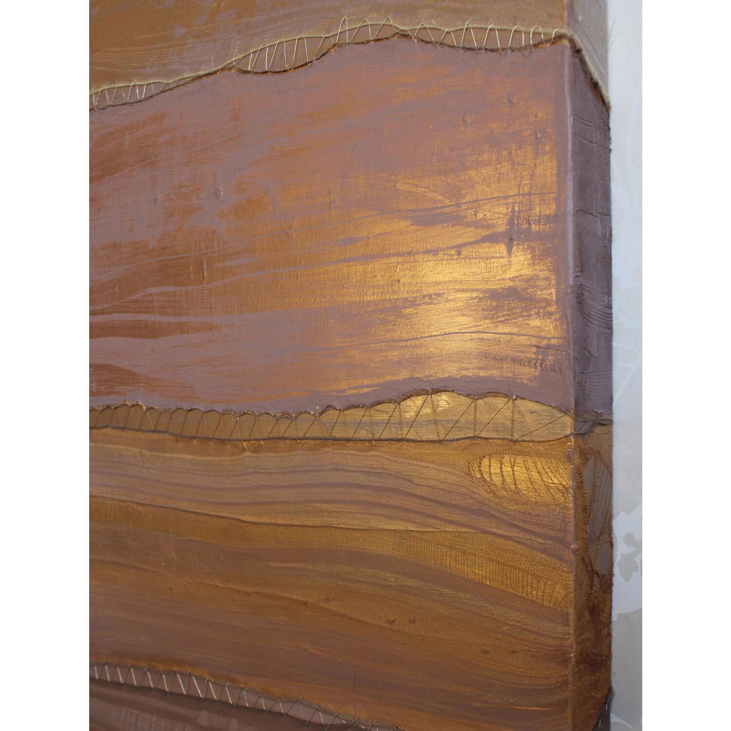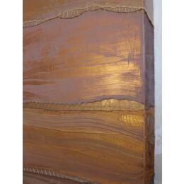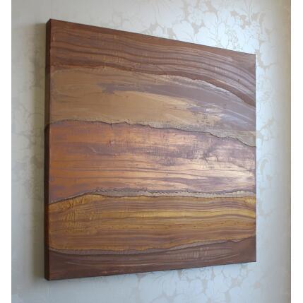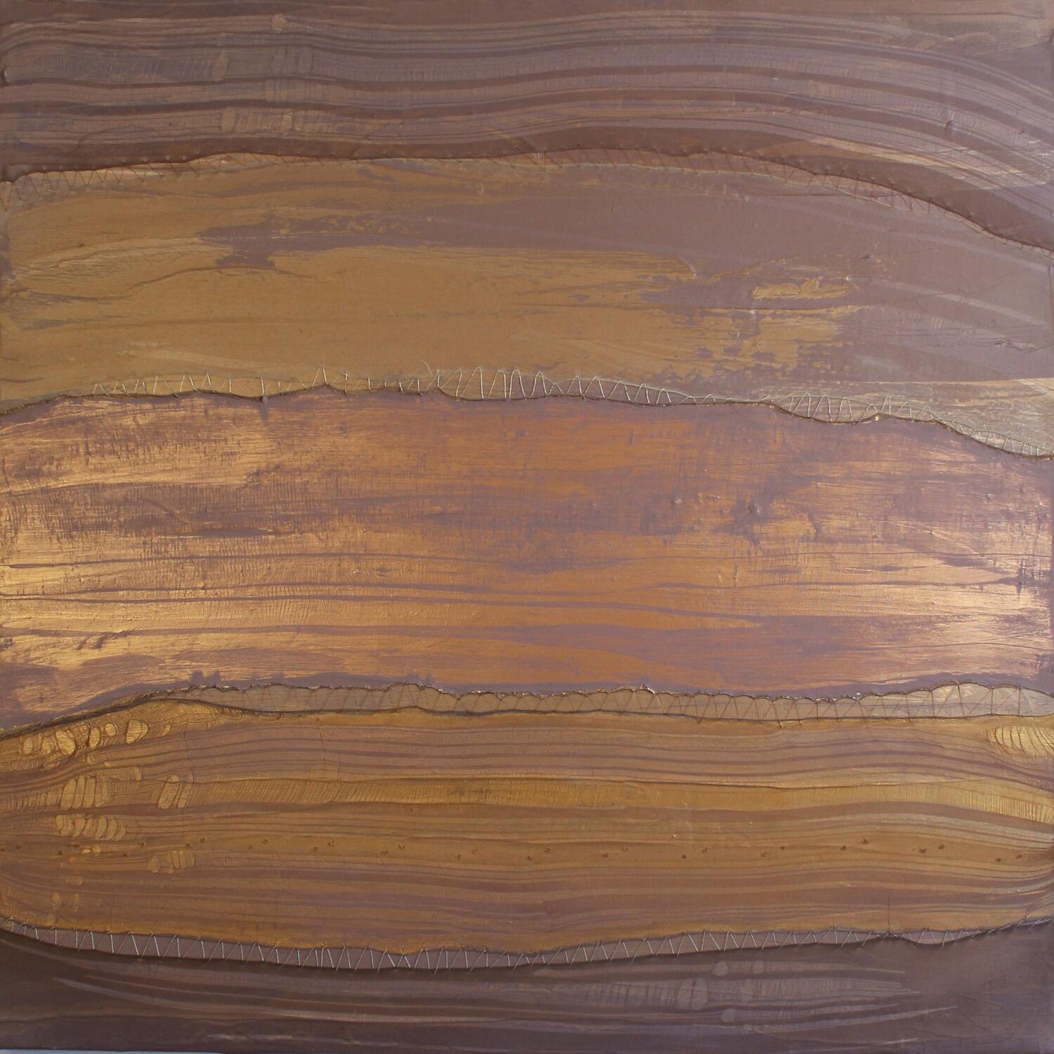L'artiste a mélangé de la peinture acrylique, du textile (des collants de récupération) et du fil pour créer cette composition de grand format sur une toile de 4 cm d'épaisseur, conférant à l’œuvre une belle présence sur le mur. Inspirée de la couleur Pantone de l'année 2025, "Mocha Mousse", rehaussée de doré et de cuivré, cette composition offre une palette riche et pleine de reflets, changeants selon la lumière, évoquant le ciel d'un monde supraterrestre.