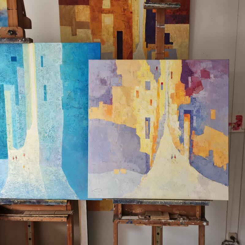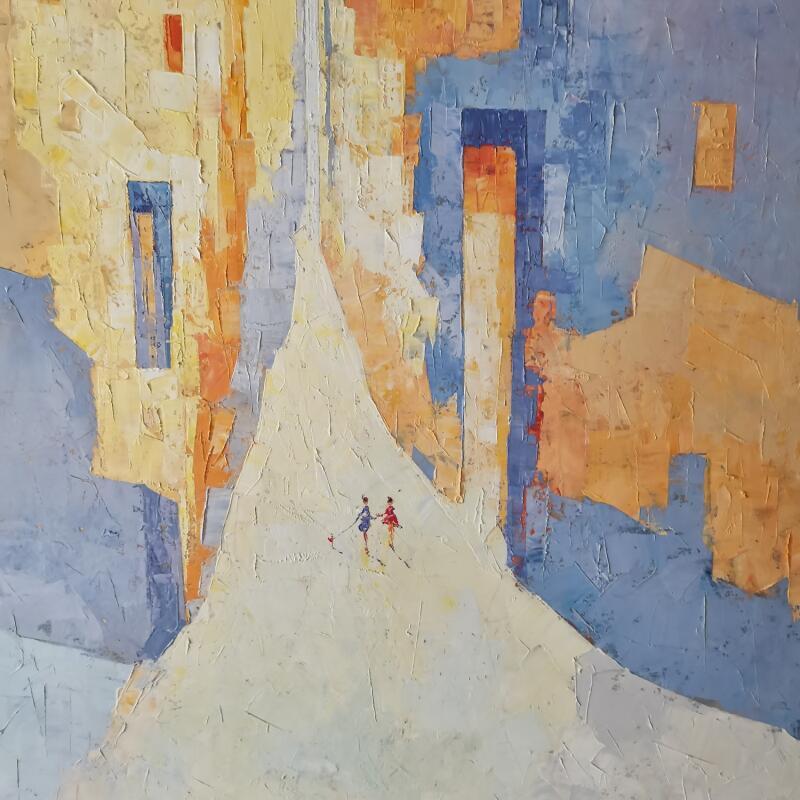 L'artiste a utilisé la technique Huile pour créer cette peinture grand format sur Toile de style Abstrait sur les thèmes Scènes de vie, Urbain.