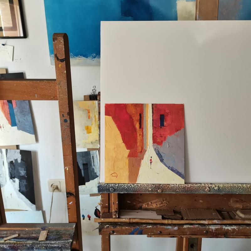 L'artiste a utilisé la technique Huile pour créer cette peinture petit format sur Papier de style Abstrait sur les thèmes Scènes de vie, Société, Urbain.