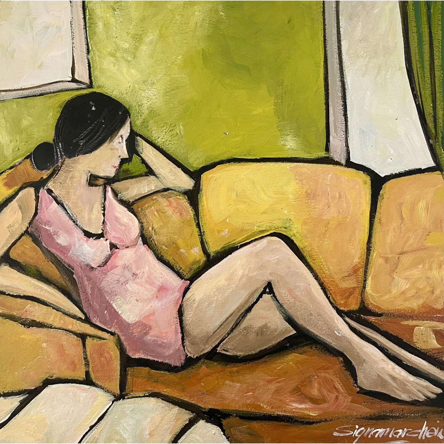 Peinture Réflexion sur canapé par Signamarcheix Bernard | Tableau Art naïf Acrylique Encre Pastel