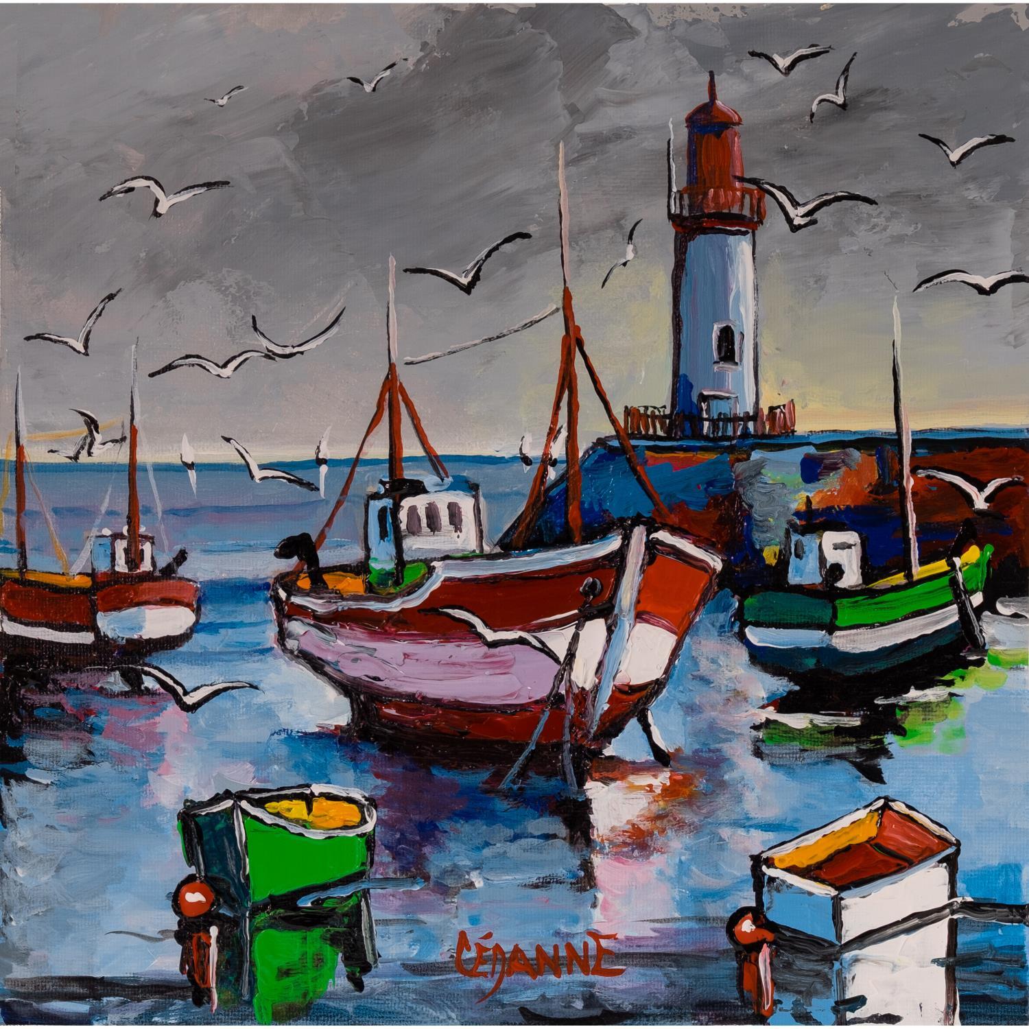 Cette œuvre d'art contemporain unique et originale, de style figuratif, a été réalisée par le peintre Cèdanne. L'artiste a utilisé différentes techniques pour créer cette peinture sur toile petit format, et traiter avec le style singulier qui lui est propre, ce paysage breton de bateaux au port à marée basse, sous un vol de mouettes.
