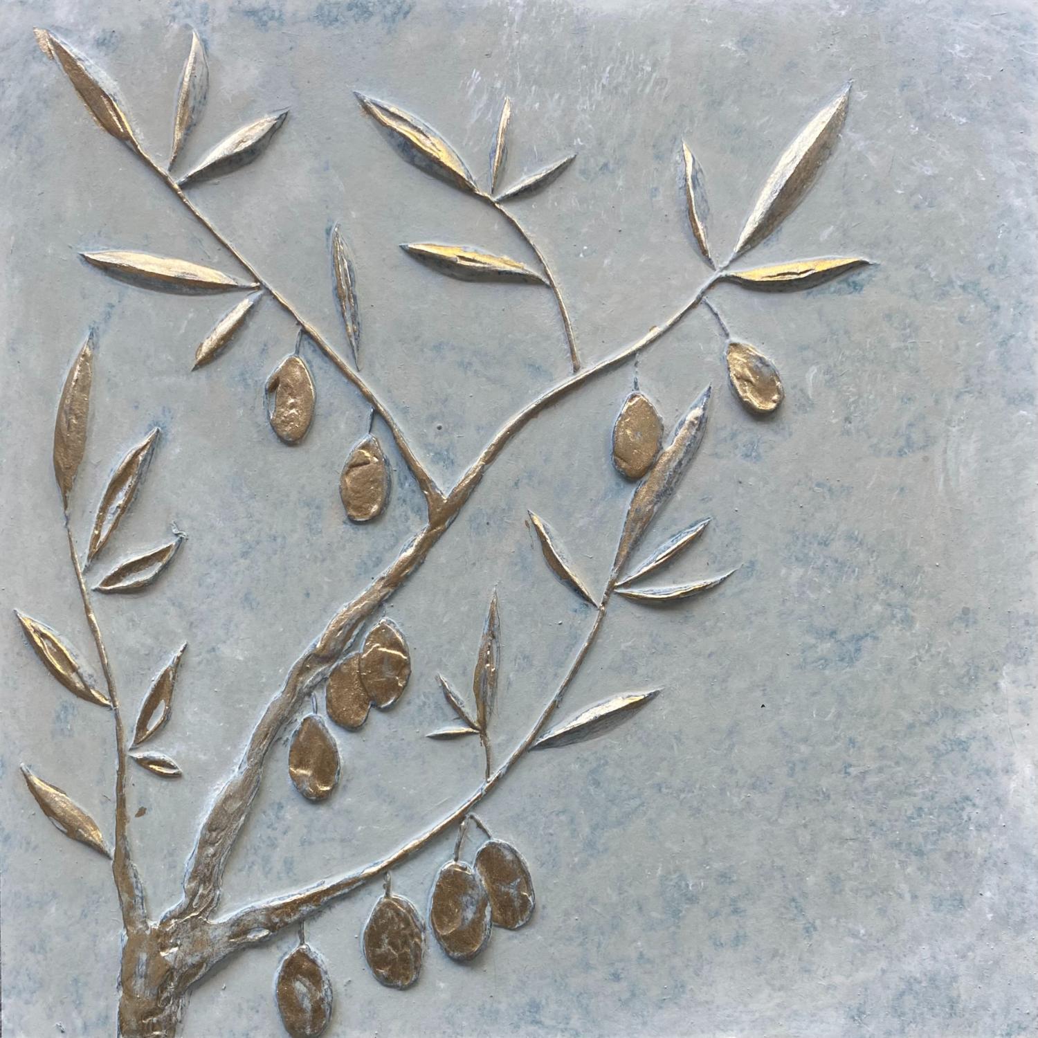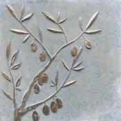 Cette oeuvre d'art contemporain unique et originale "Branches d'olivier dorées sur fond clair" a été réalisée par l'artiste contemporain Trébucq Marion .