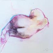 Dans cette petite acrylique sur papier, le corps se fait abstraction sensuelle, presque cosmique. L’artiste capte un fragment de chair avec une délicatesse organique, mêlant les lavis vaporeux de rose, de brun et de crème à des lignes plus franches en fuchsia et turquoise. La composition semble flotter dans un espace indéfini, comme un souvenir fugace, un souffle suspendu. Ce jeu d’opacité et de transparence, de contour et de dissolution, évoque un corps rêvé, entre présence et absence, force et douceur. Une œuvre subtilement charnelle, pleine de suggestion et de silence.