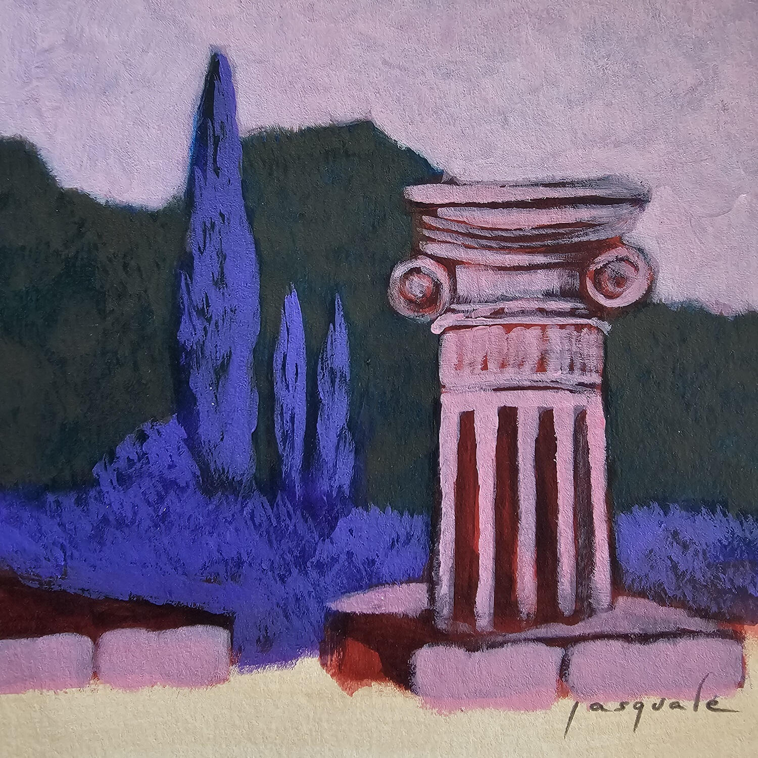 L'artiste a utilisé la technique Acrylique pour créer cette peinture petit format sur Papier de style Figuratif sur les thèmes Paysages, Architecture, Nature.