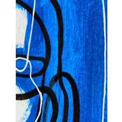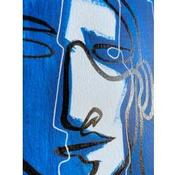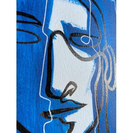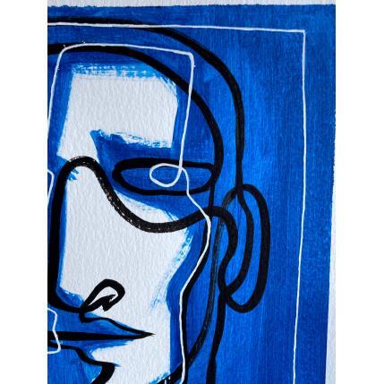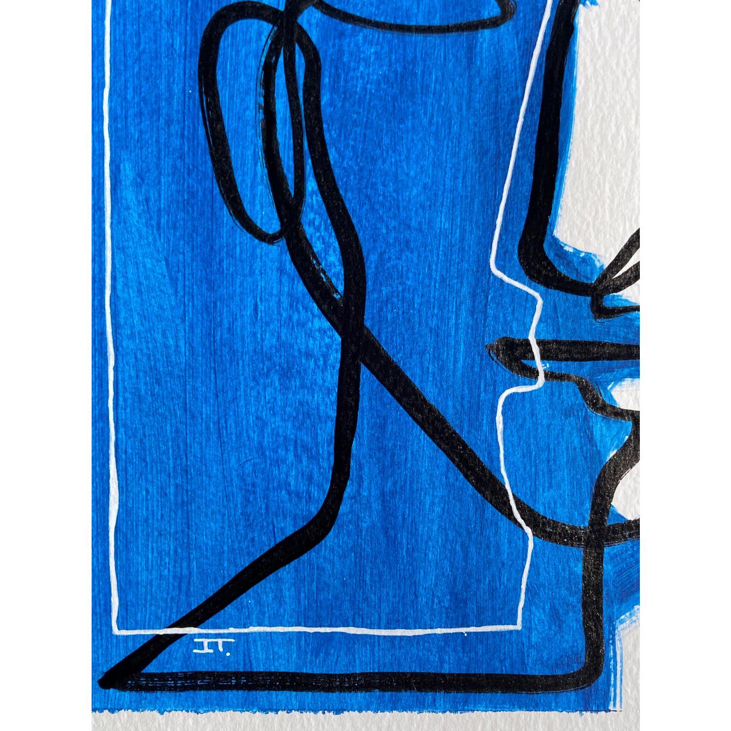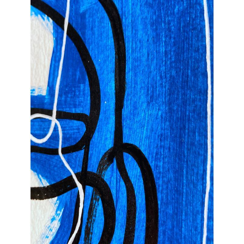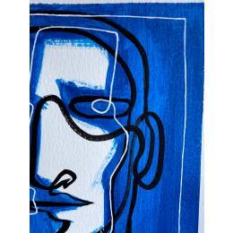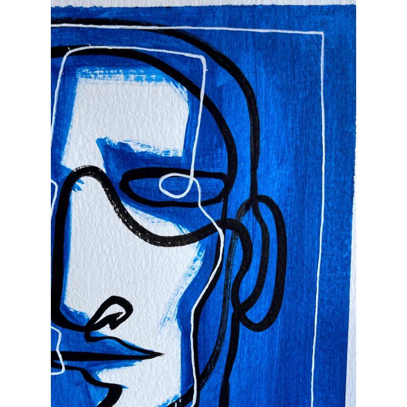 Cette œuvre d’art représente un portrait d’une personne faite dans une ligne continue de couleur noire avec de l’encre de Chine qui regarde vers le centre de l’œuvre et en arrière-plan, peut détailler que ce remplissage de couleur bleue avec la texture des coups de pinceau laissant une partie du visage en blanc, comme un faisceau de lumière qui est accompagné d’une ligne blanche très mince qui voyage dans tout l’espace et dans les volumes du visage.