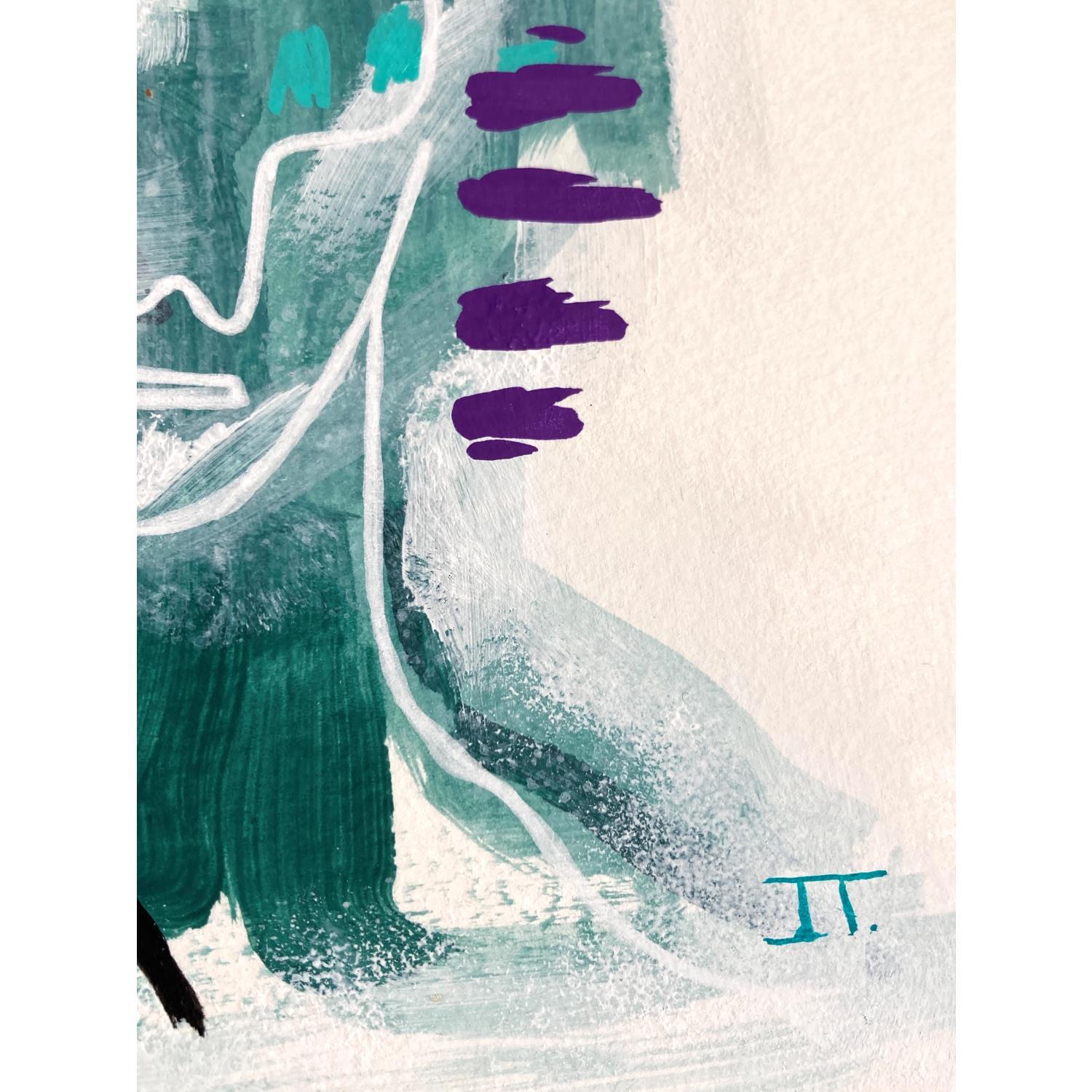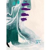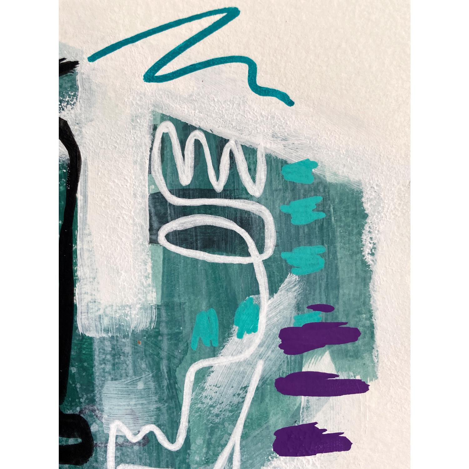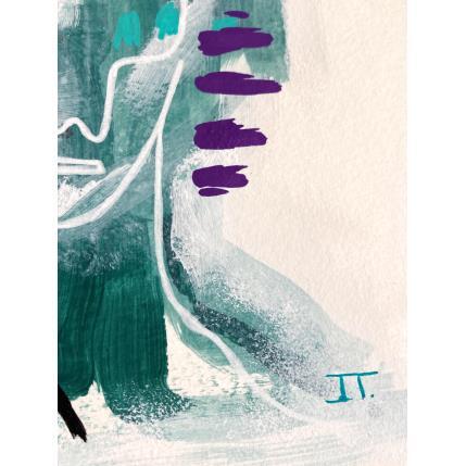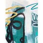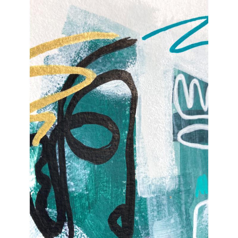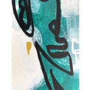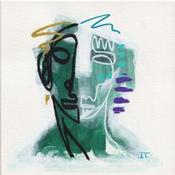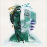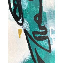 Un visage verdâtre qui sort du brouillard blanche, avec une finition assez chaotique et organique. Du côté gauche il y a des lignes plus lourdes et épaisses en noir et une autre en or, du côté droit elles sont plus légères et minces en blanc avec d’autres lignes en turquoise et violet.