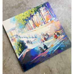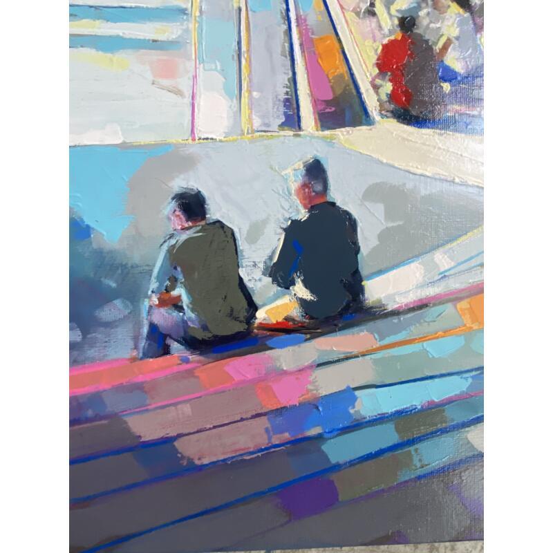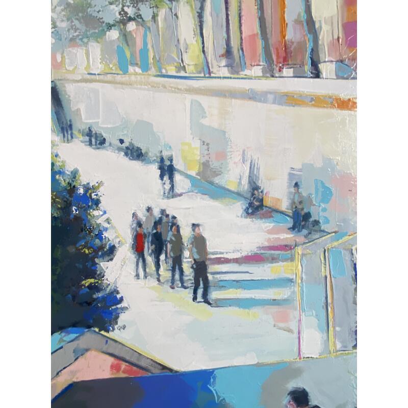 Des couleurs douces et chaudes à la fois nous invitent à imiter les personnages de la scène et flâner le l’on des quais de Saône sous un soleil radieux.