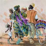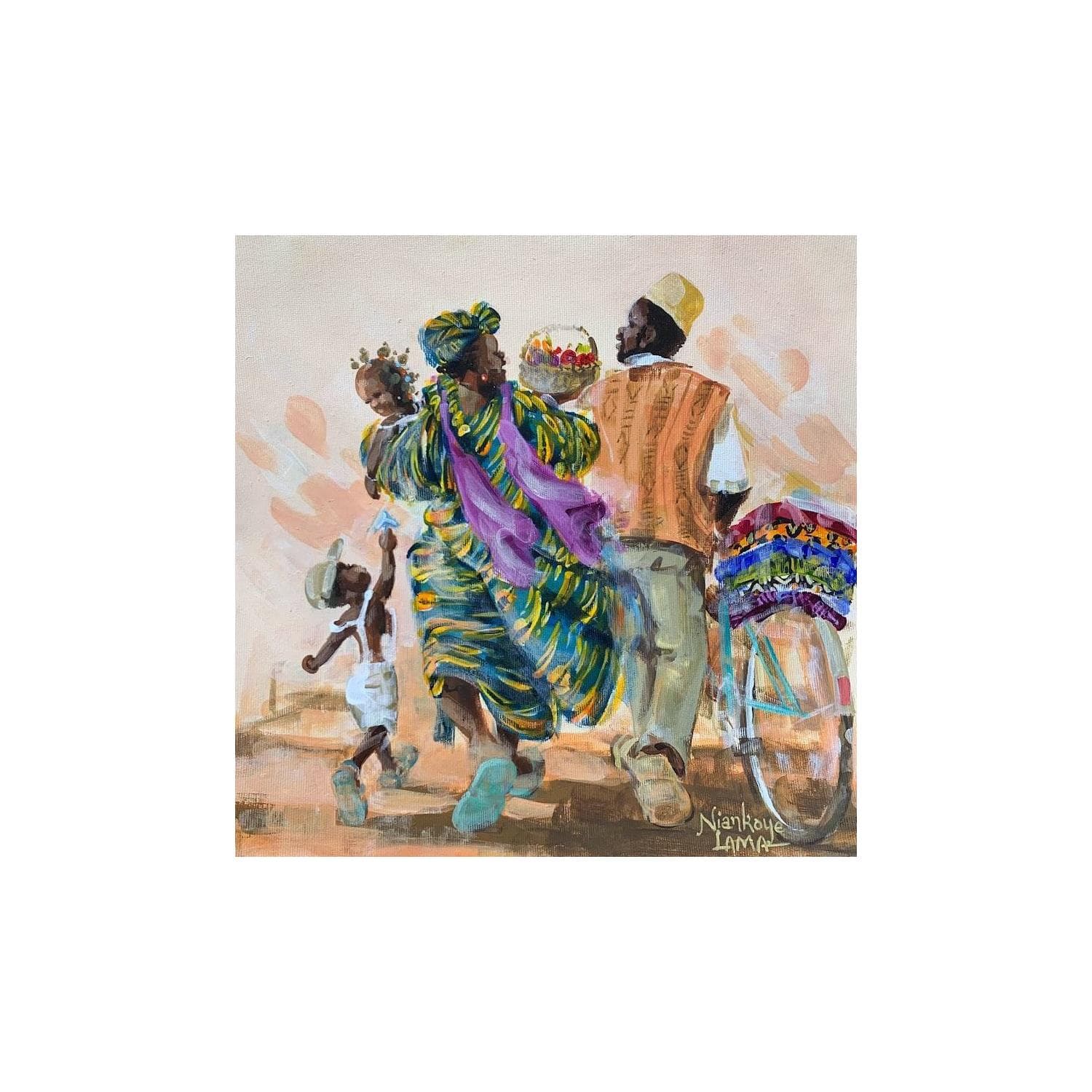 Cette oeuvre d'art contemporain unique et originale "Le Commercant de Pagnes et Famille" a été réalisée par l'artiste contemporain Lama Niankoye.