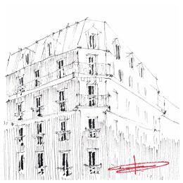 L'artiste a utilisé les techniques Aquarelle, Encre pour créer cette peinture petit format sur Papier de style Figuratif sur les thèmes Architecture, Urbain.