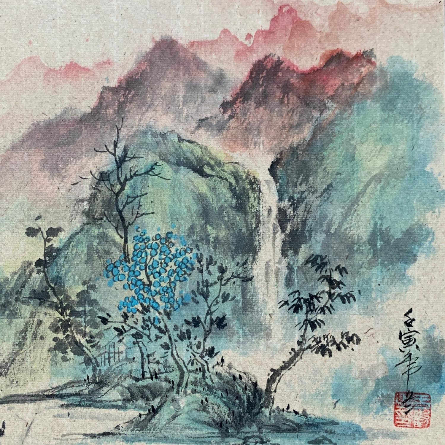 L'artiste a utilisé les techniques Aquarelle, Encre pour créer cette peinture petit format sur Papier de style Figuratif sur les thèmes Nature, Paysages.
