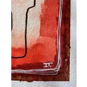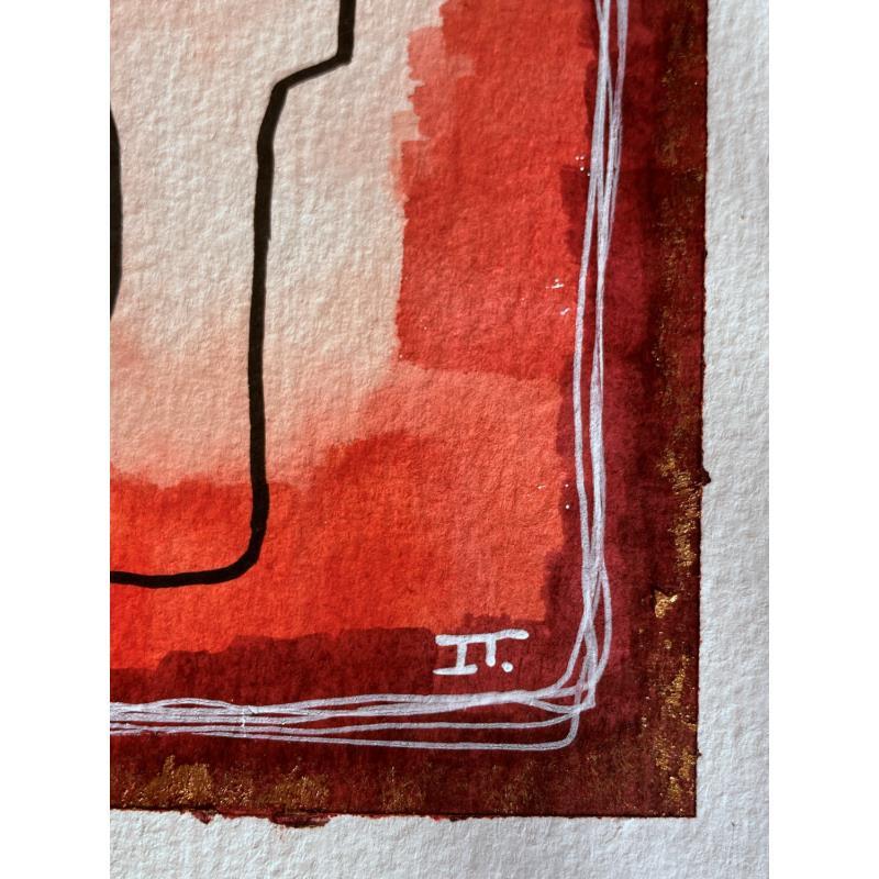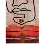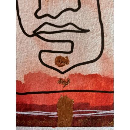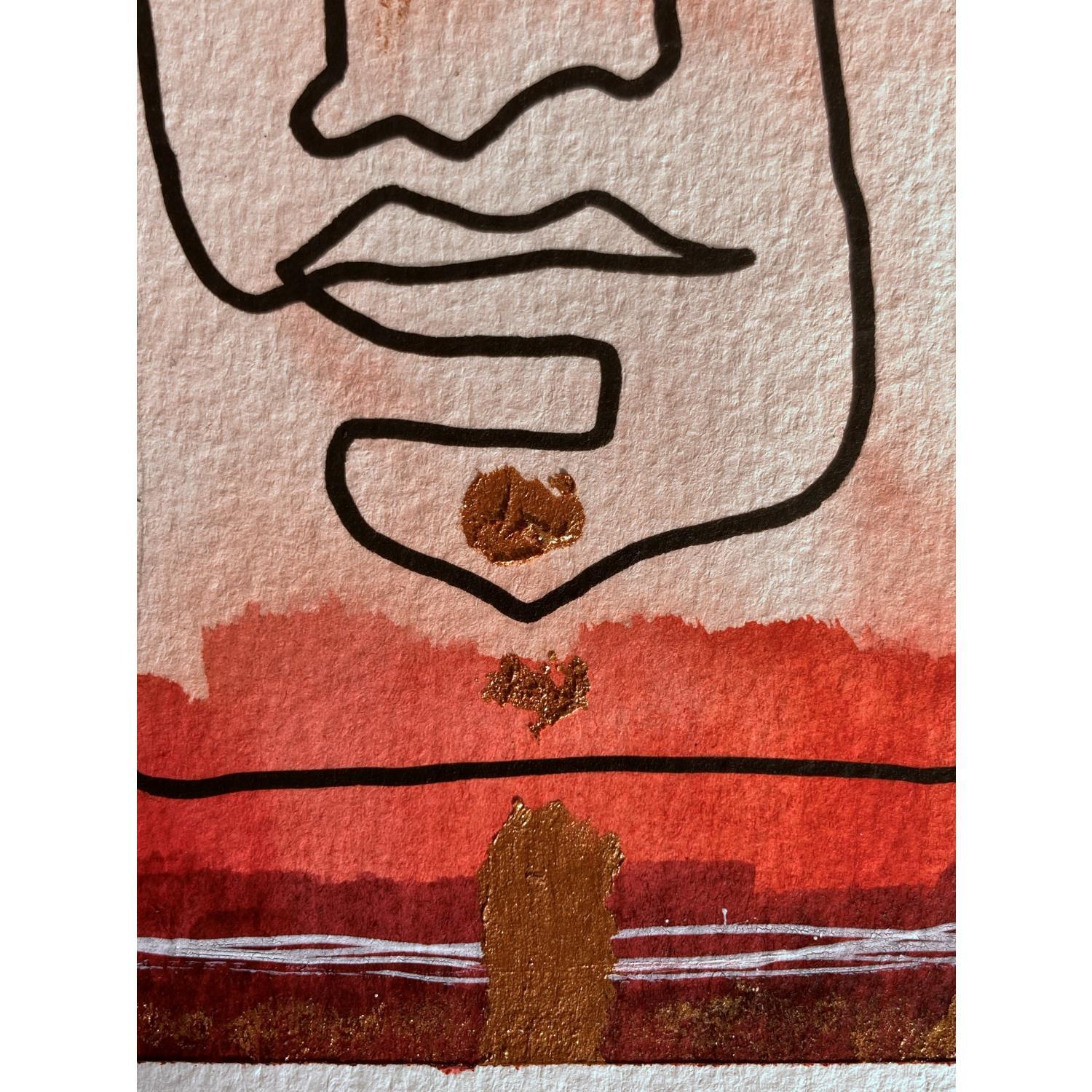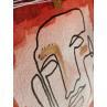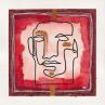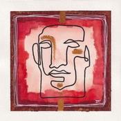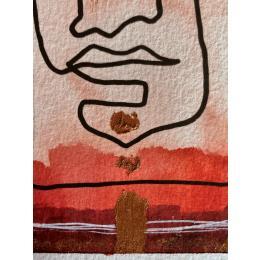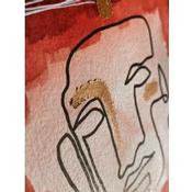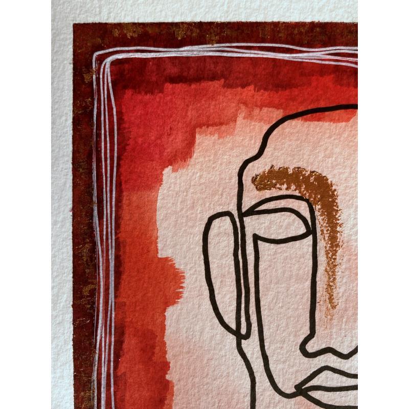 Un visage tourné vers la gauche, fait d’une seule ligne noire, encadré sur un fond rouge à trois couches du plus clair au centre au plus foncé sur les bords avec un groupe de lignes blanches formant un carré. Détails faits en or voyageant de haut en bas. la signature se trouve sur le côté droit inférieur de l’œuvre.