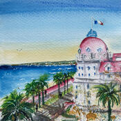 Peinture Nice Negresco crépuscule  par Hoffmann Elisabeth | Tableau Figuratif Urbain Aquarelle