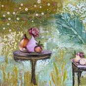 L'artiste a utilisé la technique Collage pour créer cette peinture petit format sur Toile de style Figuratif sur les thèmes Natures mortes, Paysages.