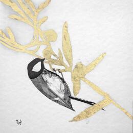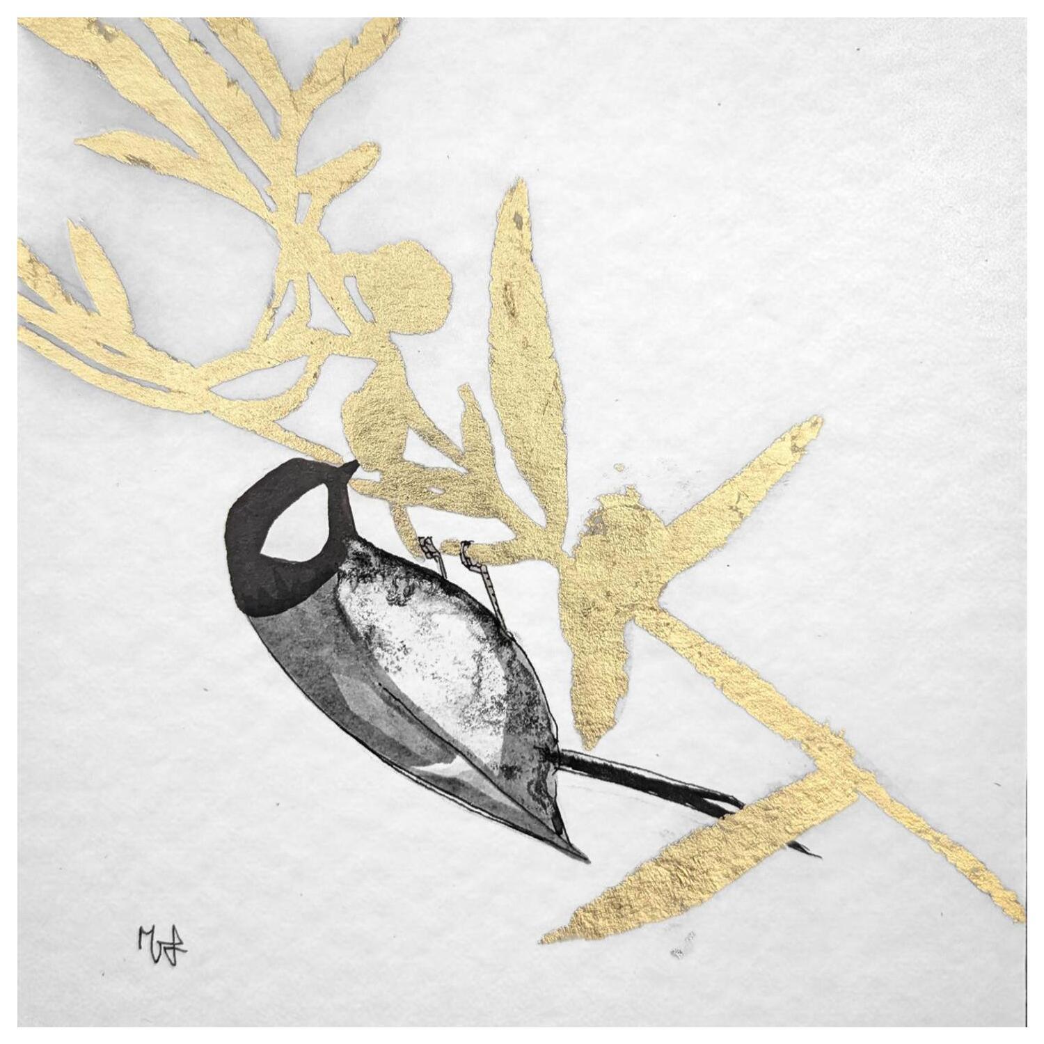 Mésange, Brindille 2Peinture Mésange, Brindille 2 par Mü | Tableau Figuratif Nature Animaux Noir & blanc Encre Feuille d'or