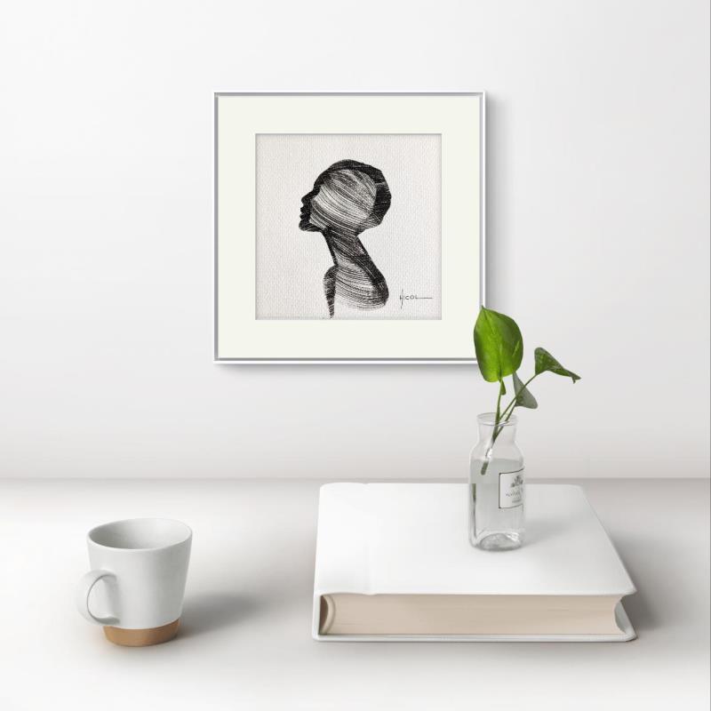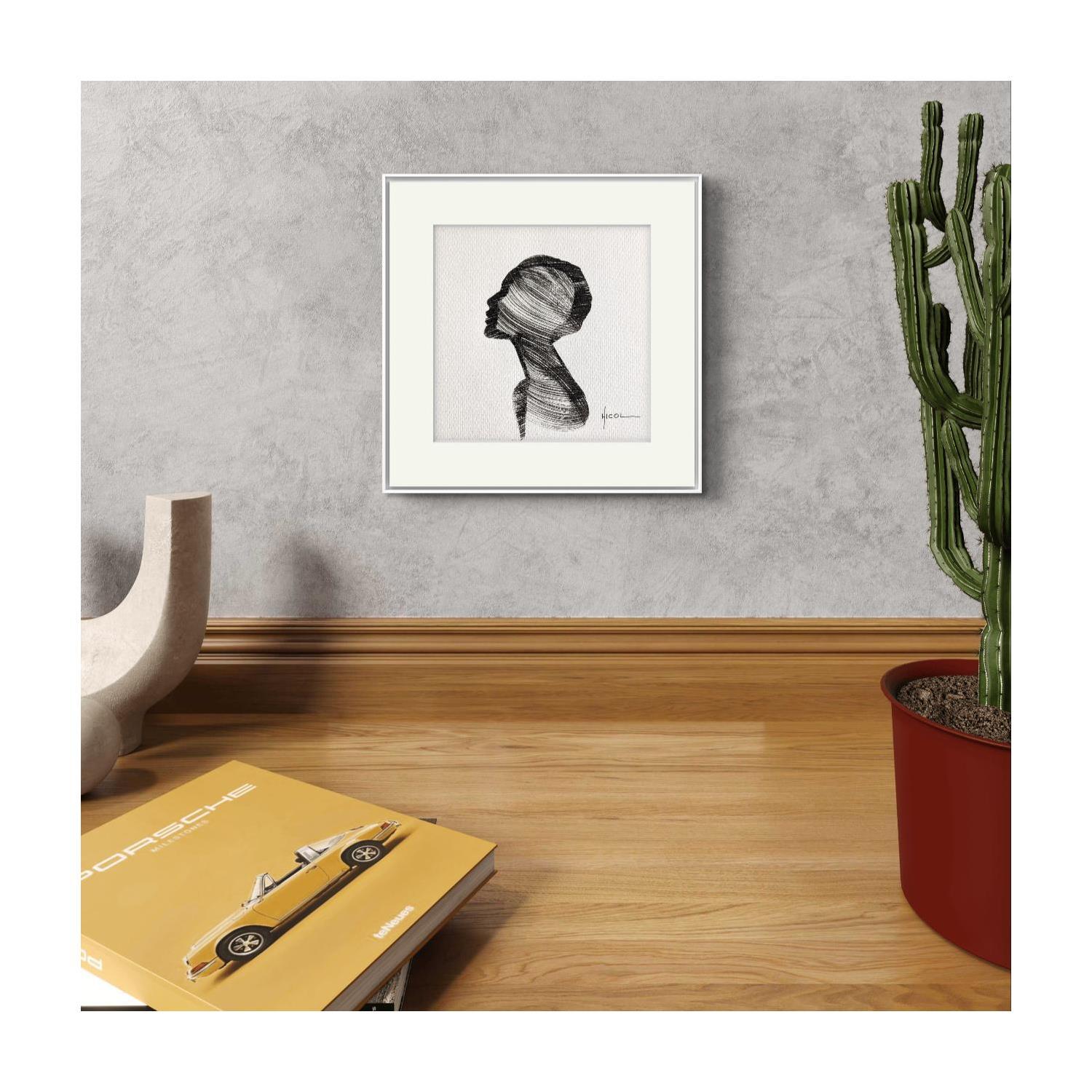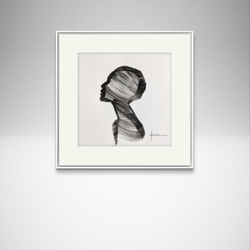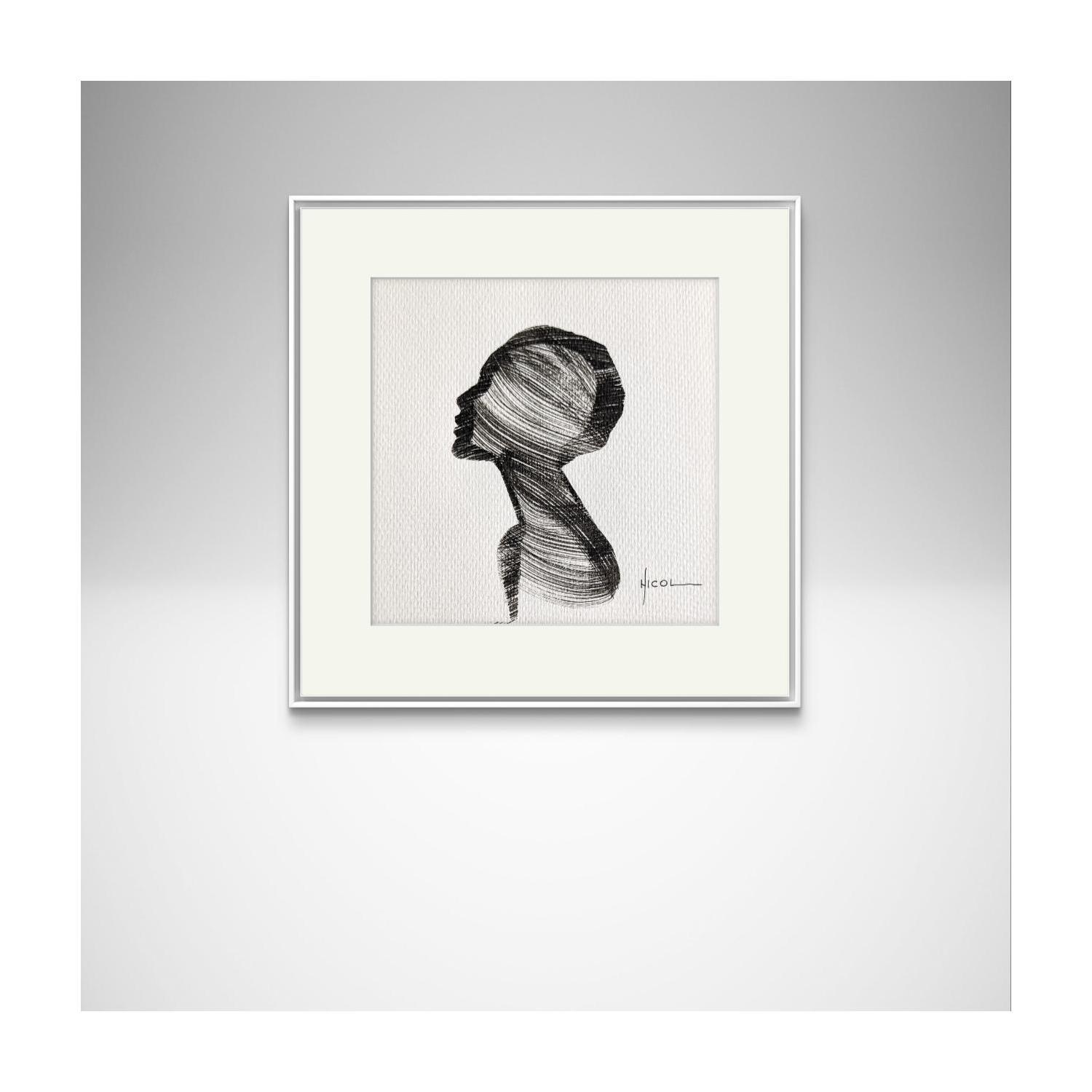 L'artiste a utilisé la technique Encre pour créer cette peinture petit format sur Papier de style Figuratif sur les thèmes Portraits, Minimaliste, Noir & blanc.