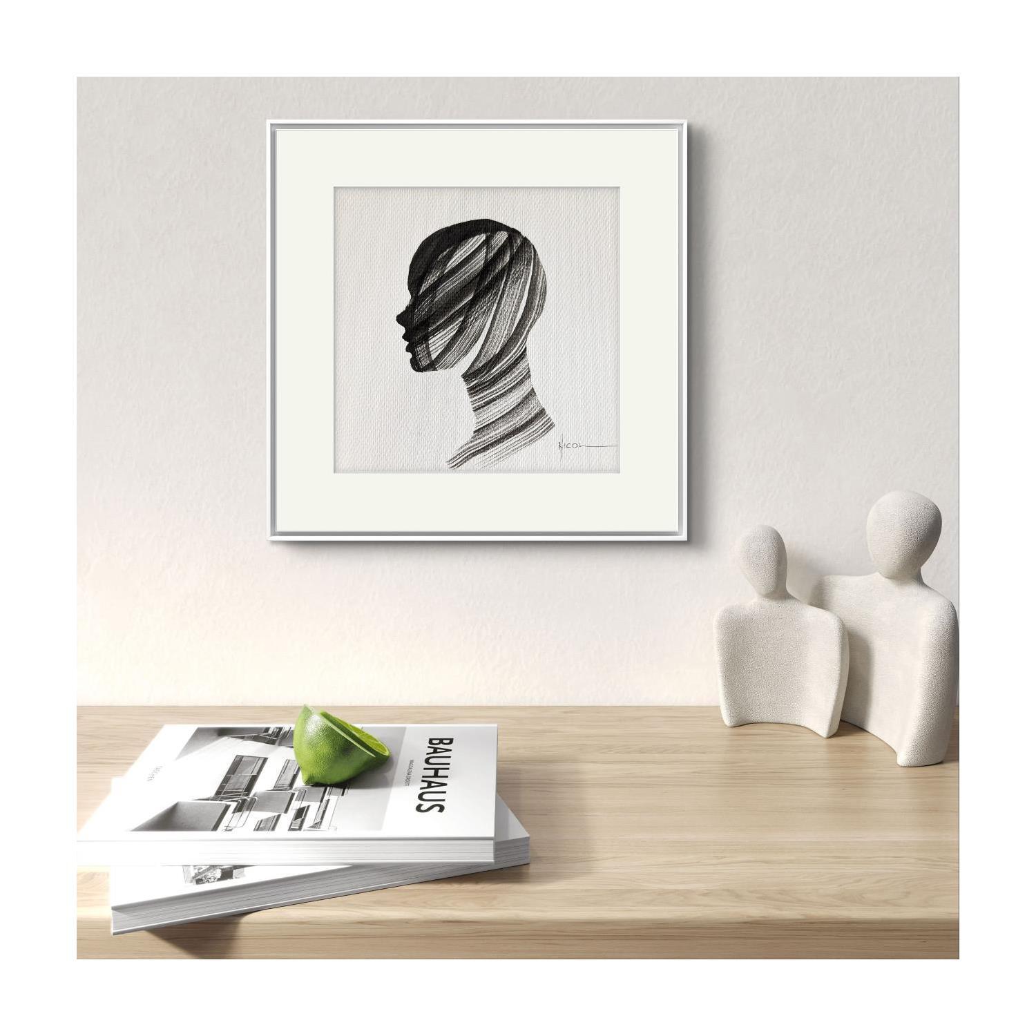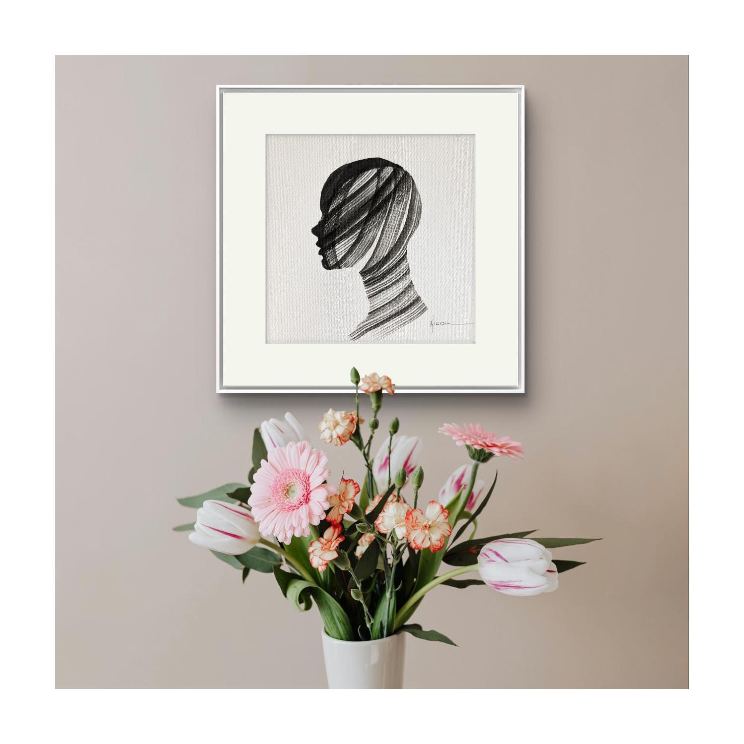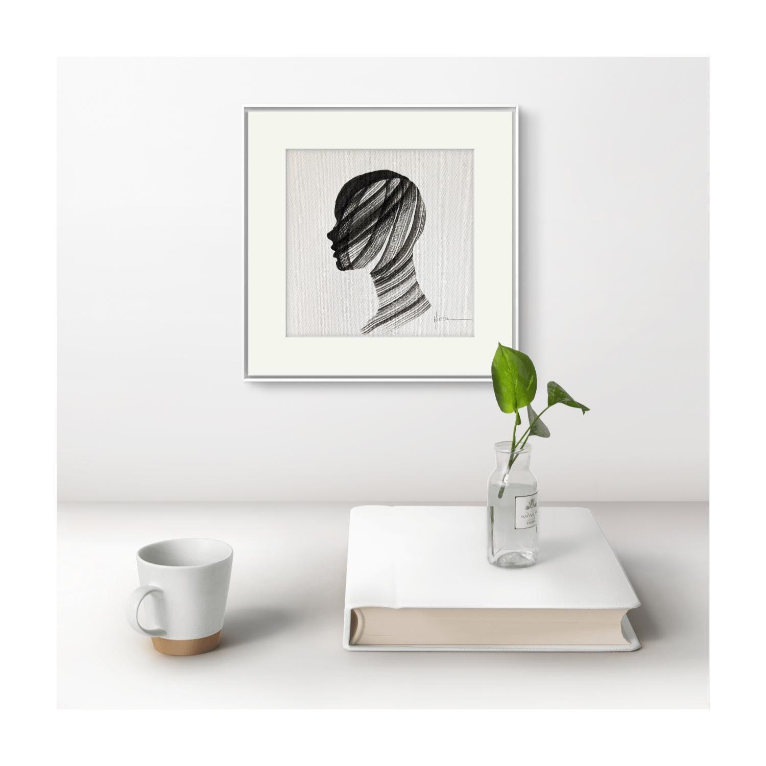 L'artiste a utilisé les techniques Encre, Papier pour créer cette peinture petit format sur Papier de style Figuratif sur les thèmes Portraits, Minimaliste, Noir & blanc.