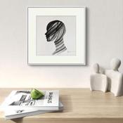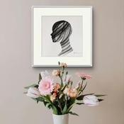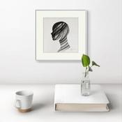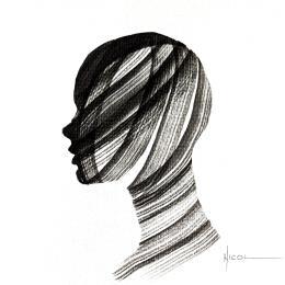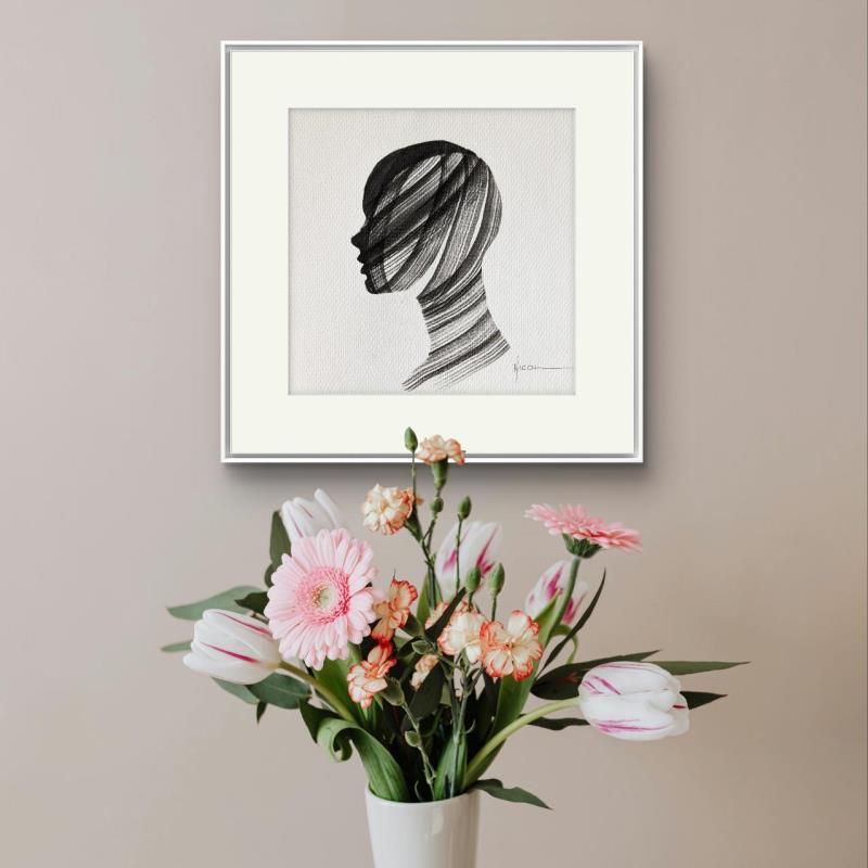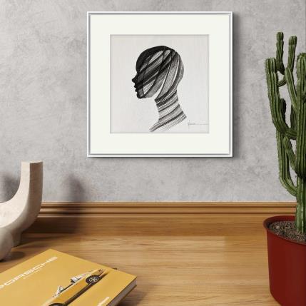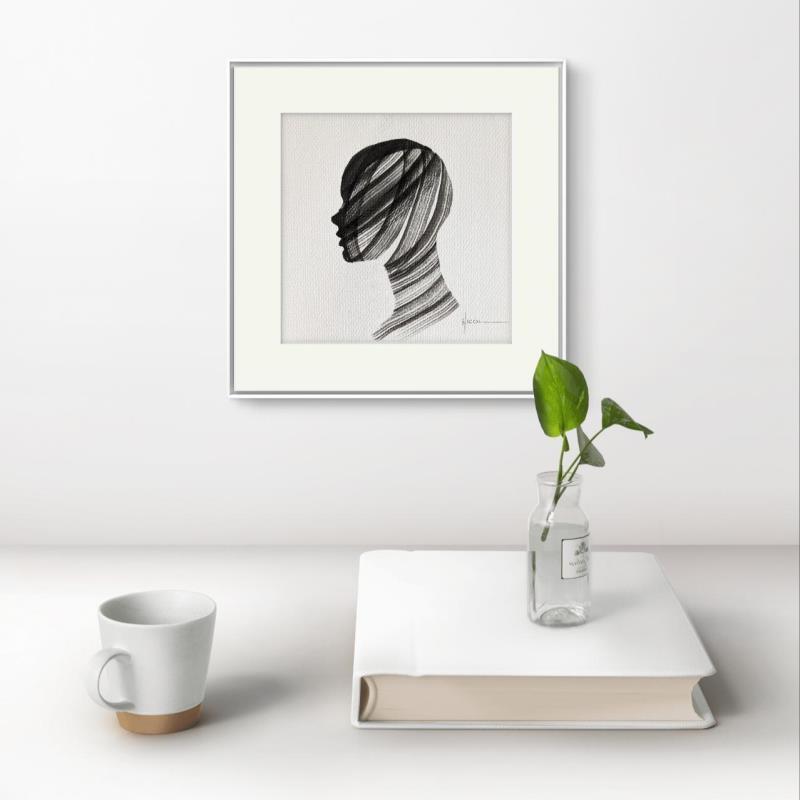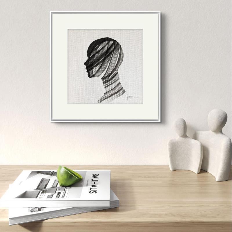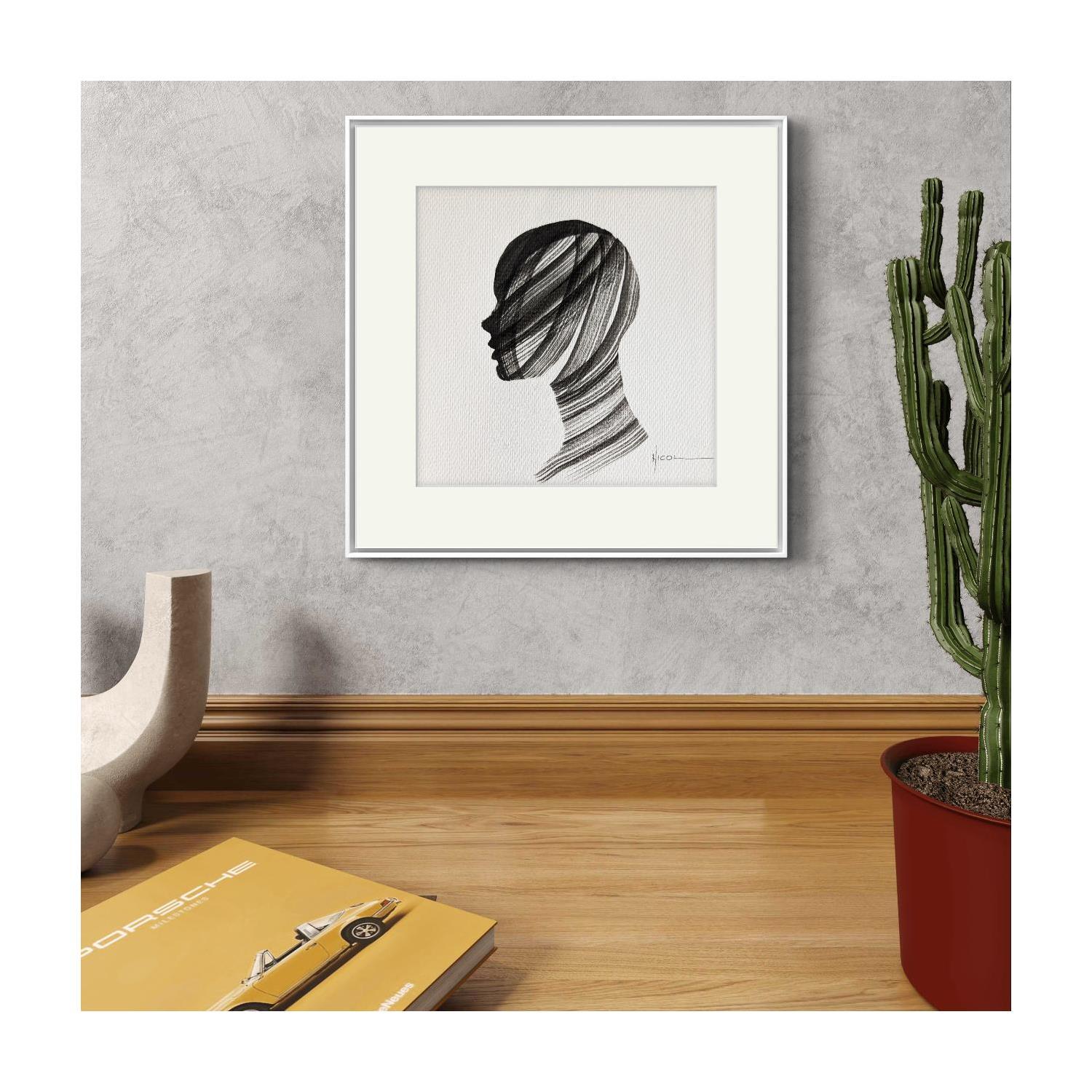 L'artiste a utilisé les techniques Encre, Papier pour créer cette peinture petit format sur Papier de style Figuratif sur les thèmes Portraits, Minimaliste, Noir & blanc.