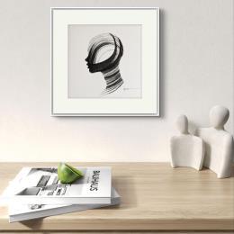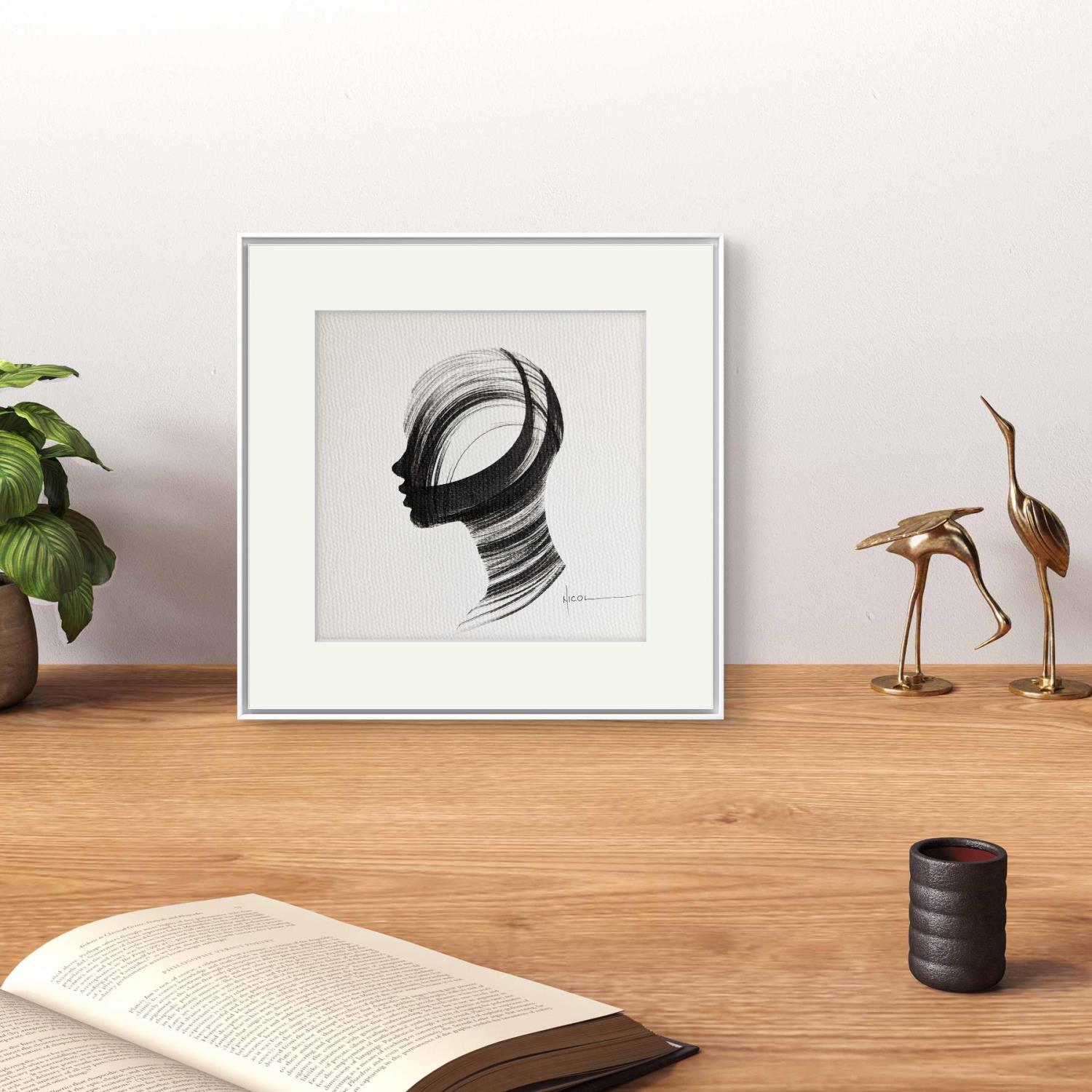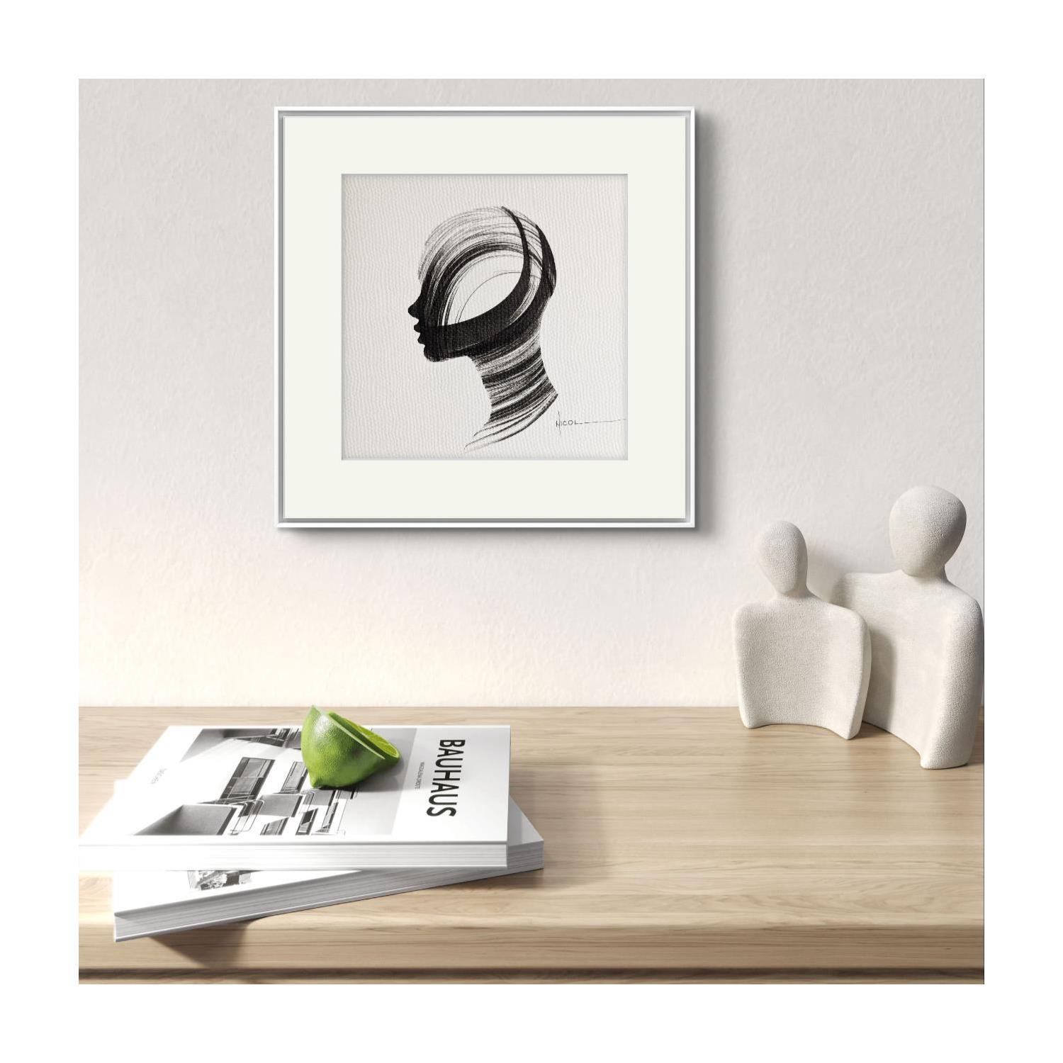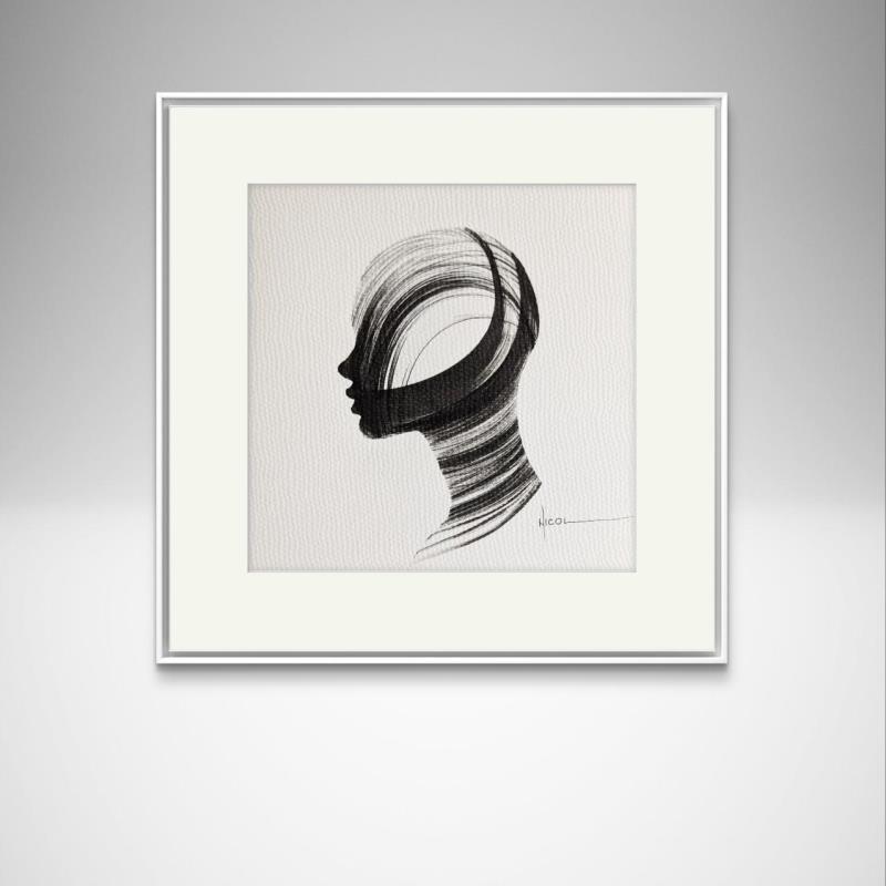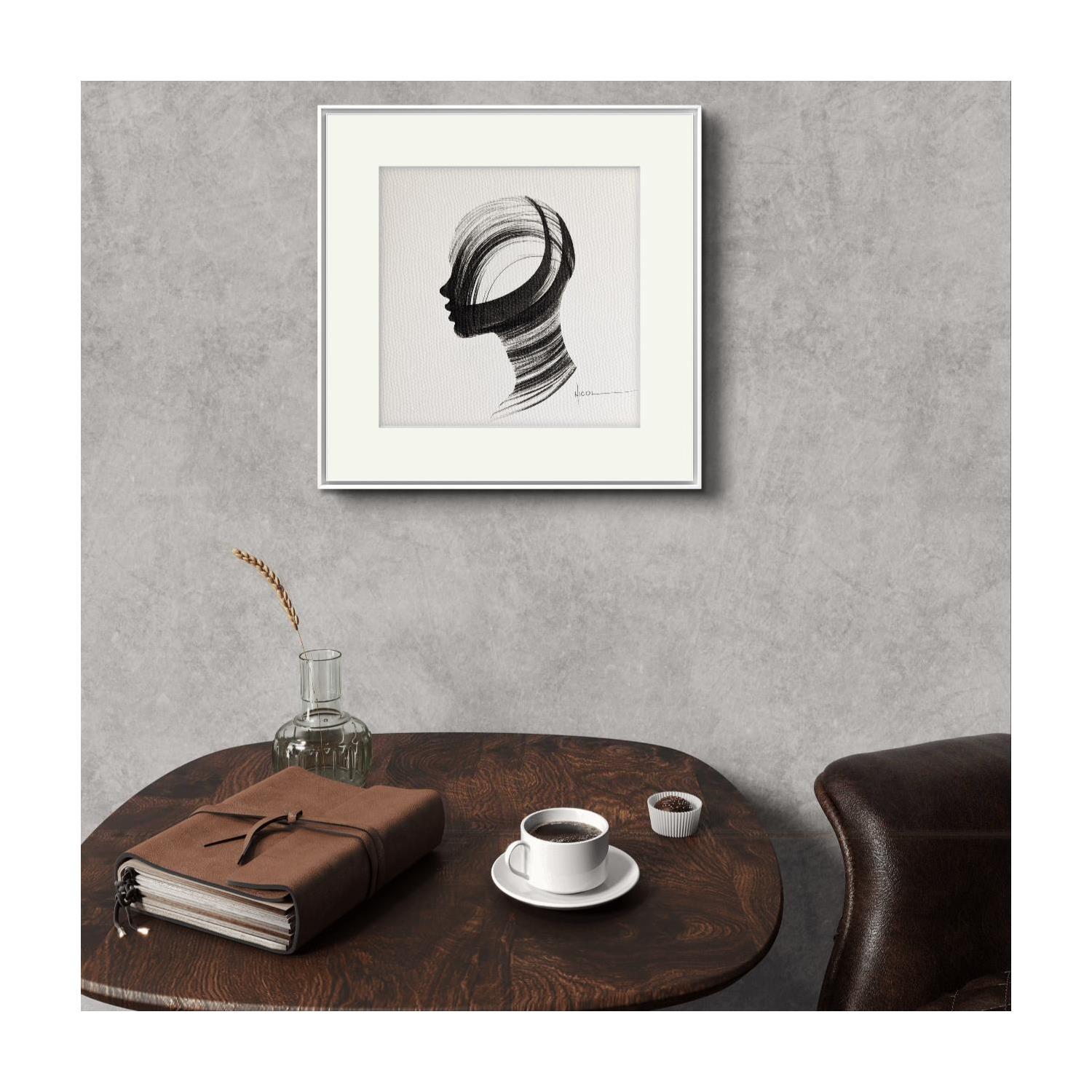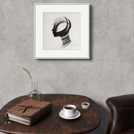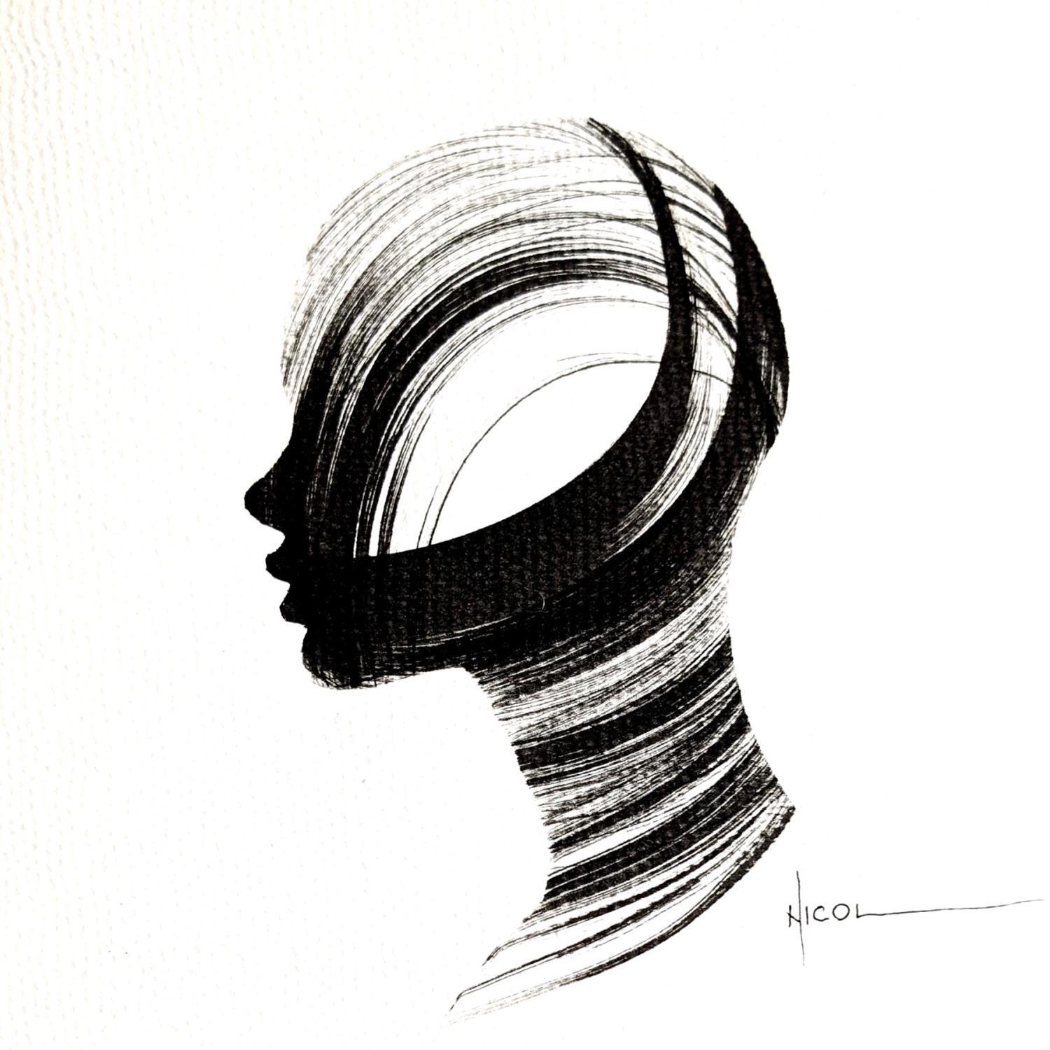 L'artiste a utilisé la technique Encre pour créer cette peinture petit format sur Papier de style Figuratif sur les thèmes Portraits, Noir & blanc, Minimaliste.