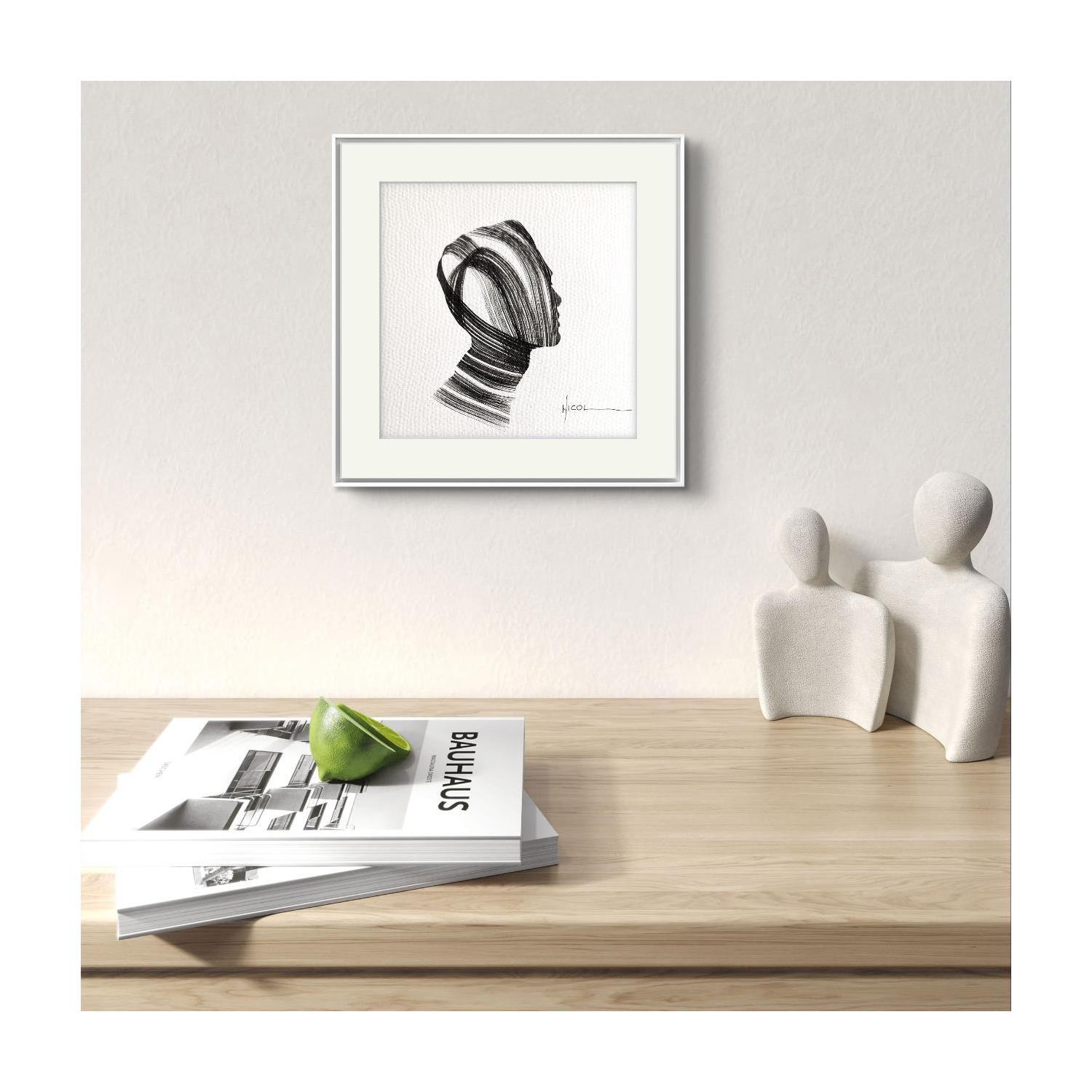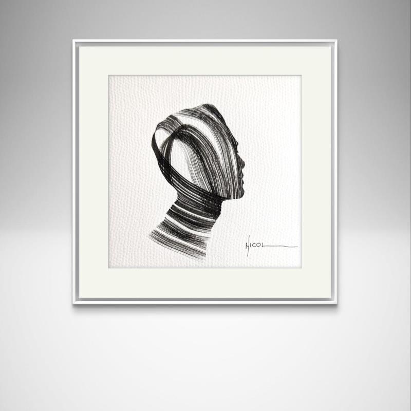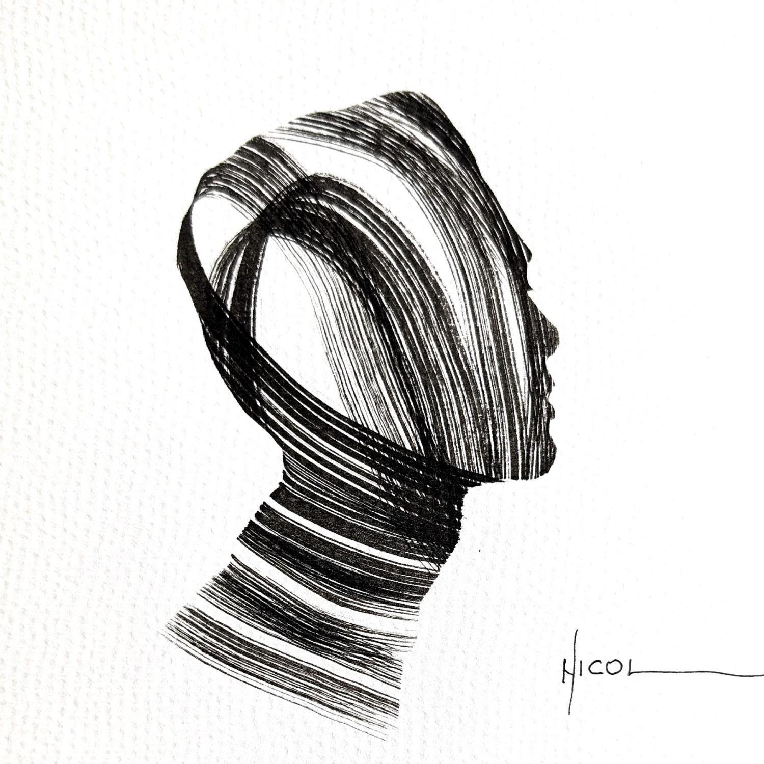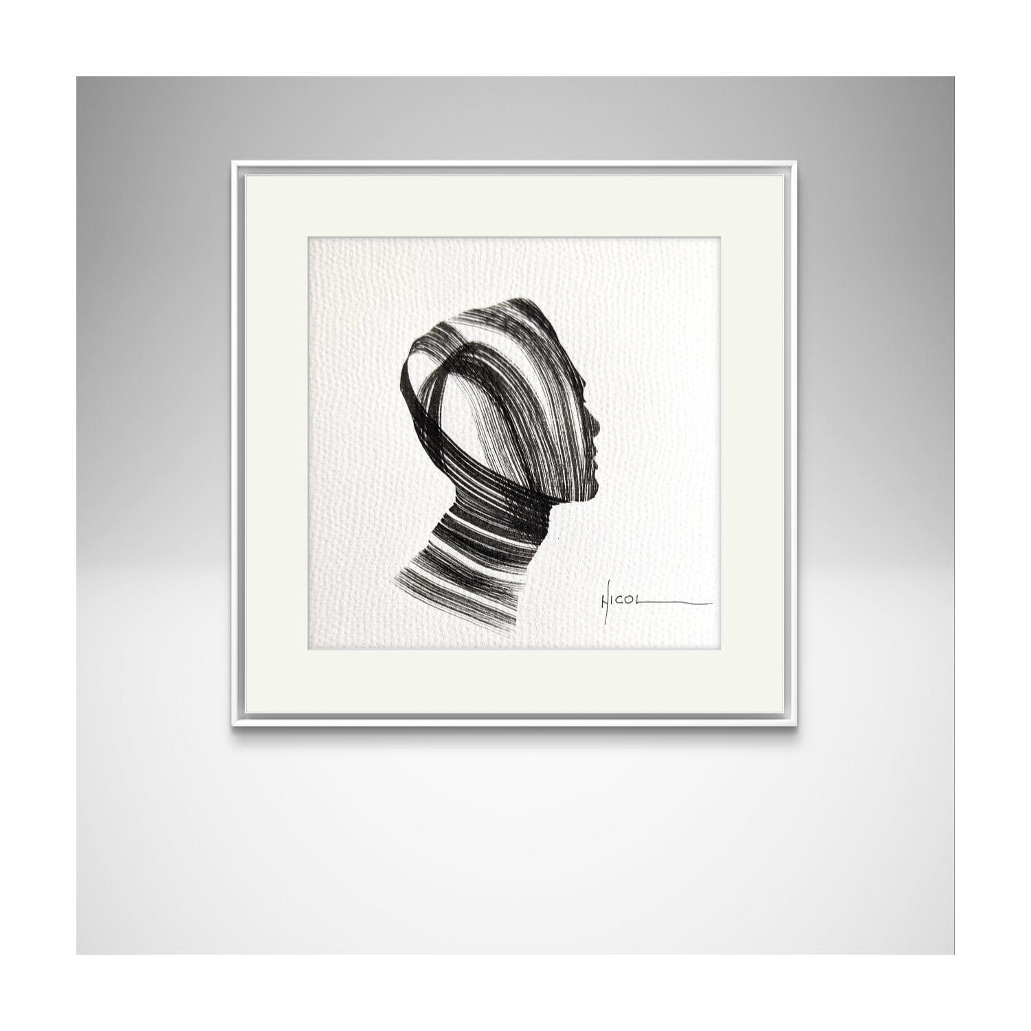 L'artiste a utilisé la technique Encre pour créer cette peinture petit format sur Papier de style Figuratif sur les thèmes Portraits, Minimaliste, Noir & blanc.