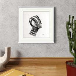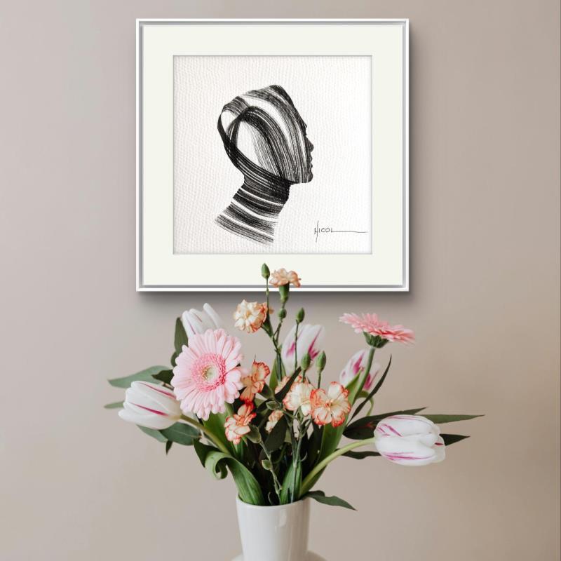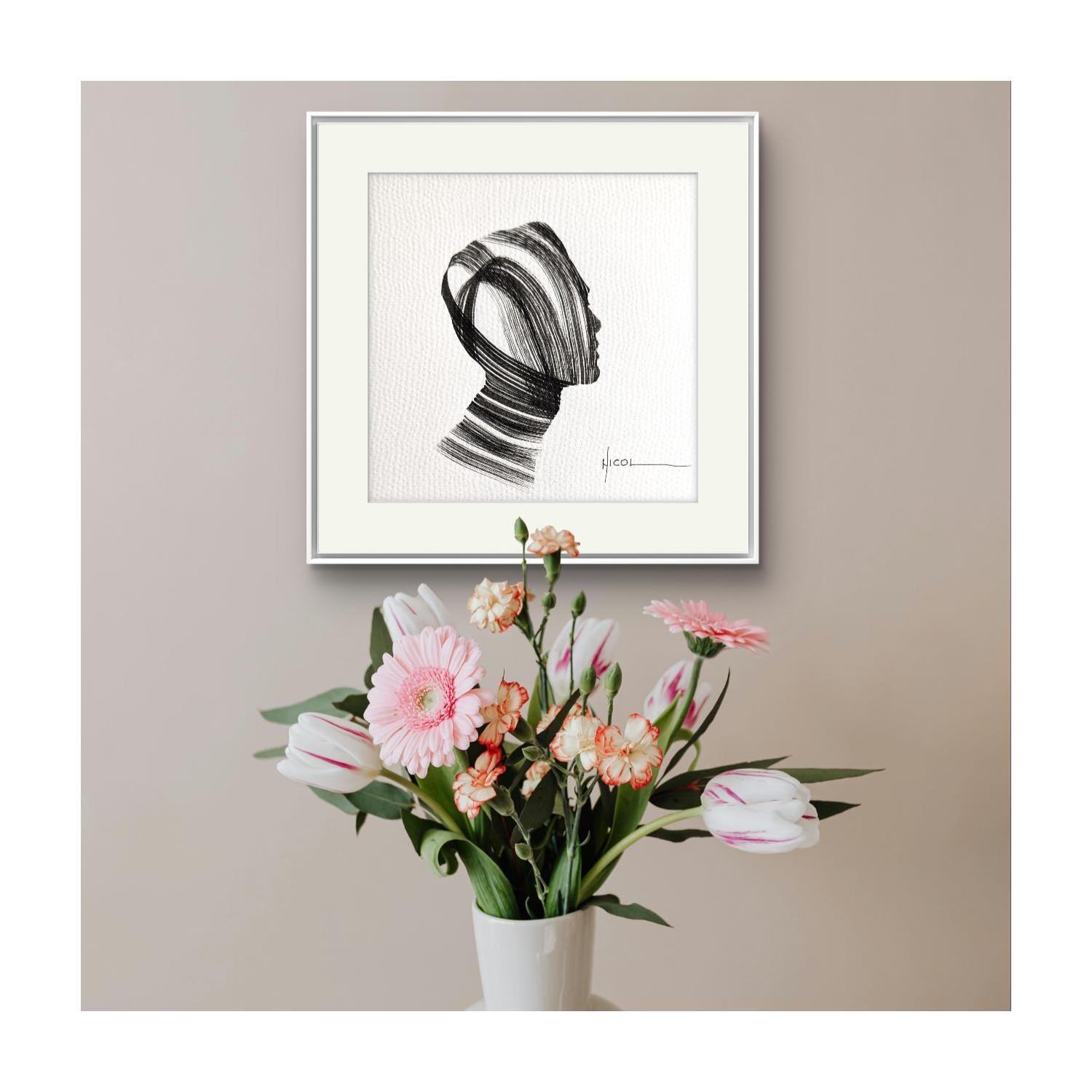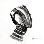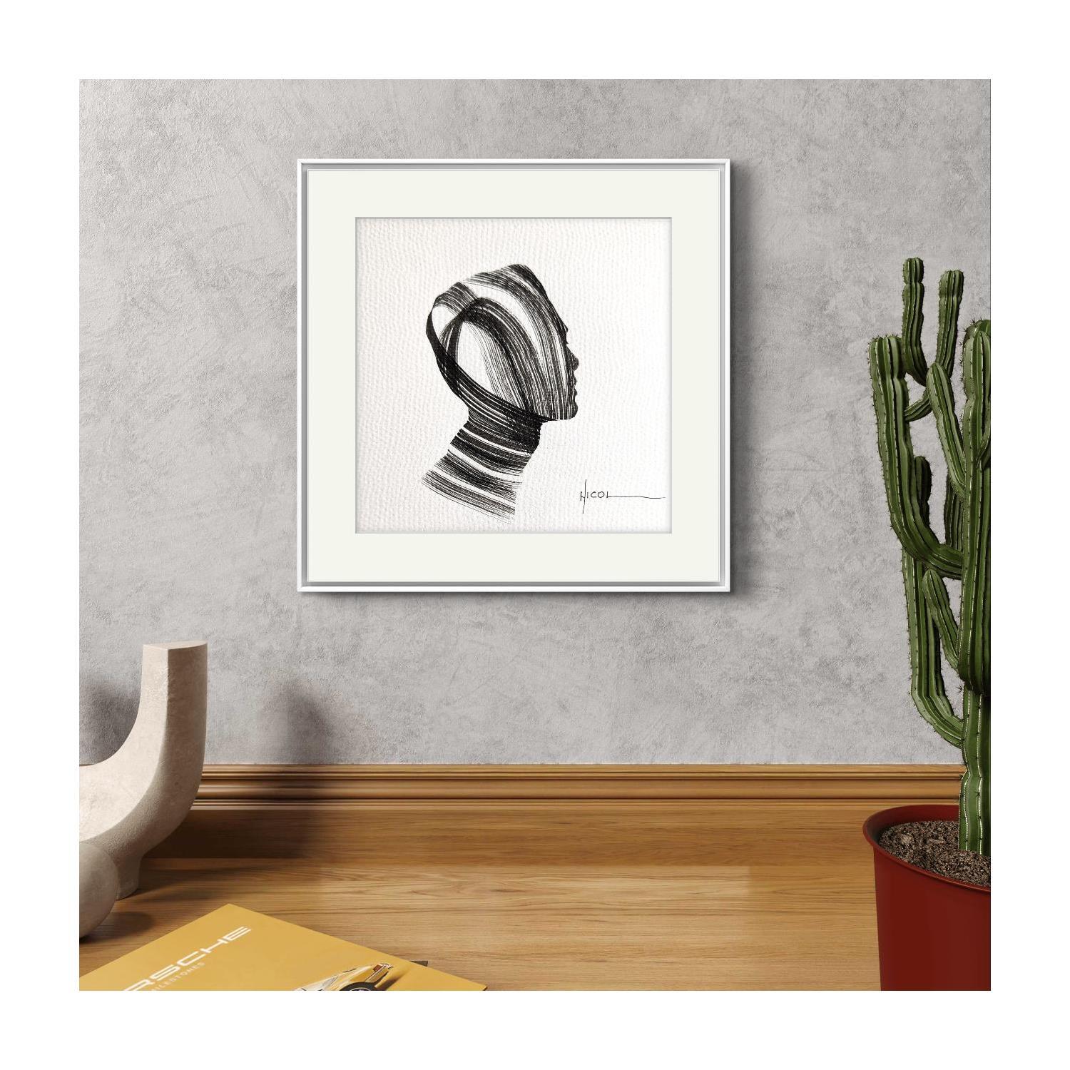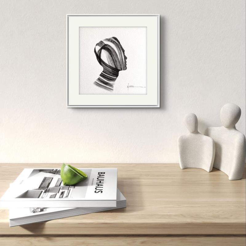 L'artiste a utilisé la technique Encre pour créer cette peinture petit format sur Papier de style Figuratif sur les thèmes Portraits, Minimaliste, Noir & blanc.