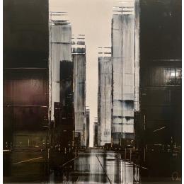 Bien qu'étant achromatopsique (absence de perception des couleurs), Julien Rey nous fait voyager à travers ses toiles aux paysages urbains. L'histoire de Julien Rey commence comme toutes les belles histoires : par un rêve impossible. Achromatopsique, l'artiste ne voit qu'en noir et blanc. Pourtant, cette maladie ne l'empêche pas de voyager aux confins de la Birmanie, de changer de vie (il y devient moine bouddhiste) ou de se lancer dans l'art. De son voyage en Birmanie, il ramène une parfaite maîtrise de la feuille d'or, élément caractéristique de son travail. Sa technique à base de laque travaillée au couteau et d'incrustations de feuille d'or place la lumière au centre de ses œuvres. Marqué par la philosophie zen, il réalise des compositions minimales qui apparaissent comme des instants suspendus, des pauses poétiques.