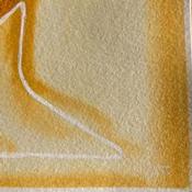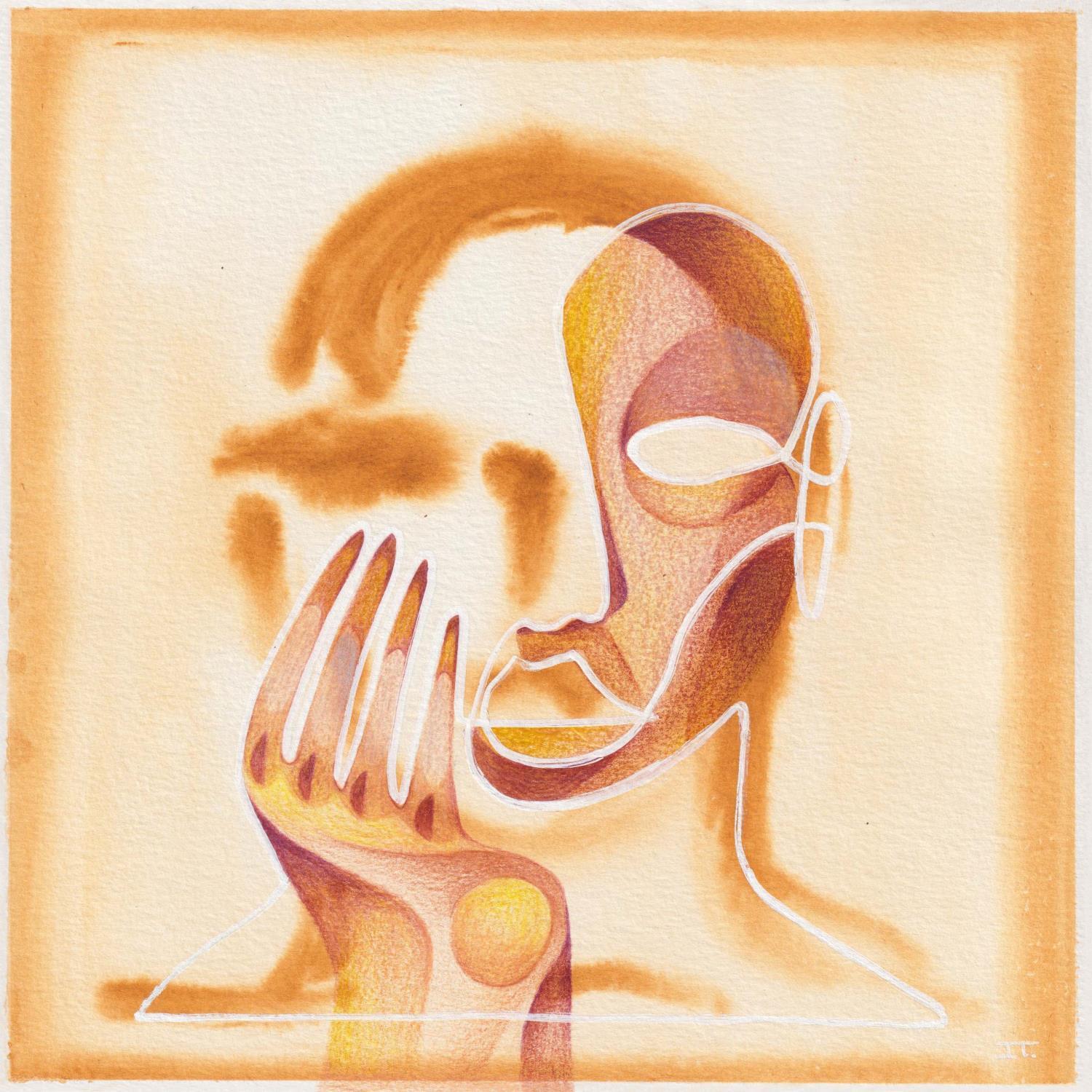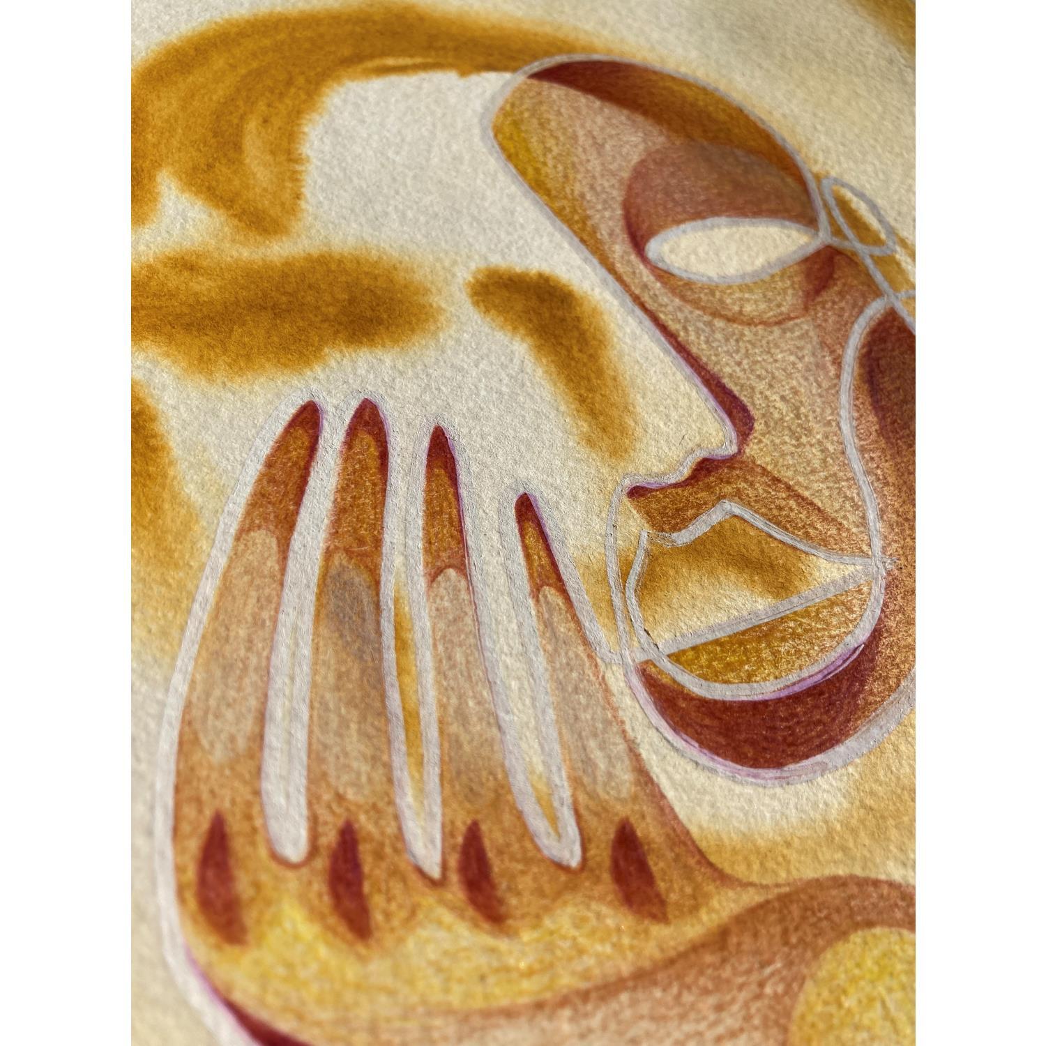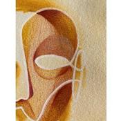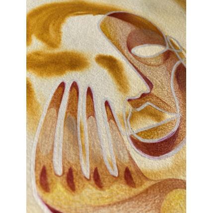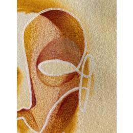 Cette œuvre d’art unique, est un portrait d’une personne de face et fait d’une seule ligne continue blanche en Posca, rempli de crayons de couleur créant des volumes de visage comme si c’était un masque avec une texture très différente en arrière-plan donnant une sensation de profondeur de champ. Il est généralement basé sur des couleurs jaunes et brunes.