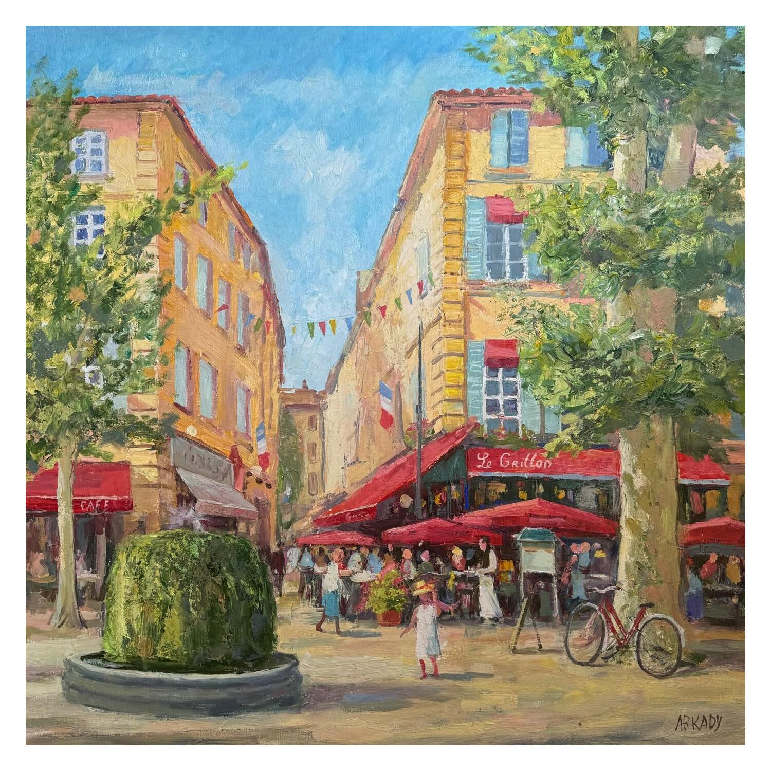 Ce tableau représente une scène du quotidien à Aix-en-Provence, dans une rue très vivante que j’aime particulièrement. J’ai choisi de peindre le café « Le Grillon », un lieu emblématique pour moi. J’aime m’y installer pour boire un café, lire mon journal et simplement observer la vie qui se déroule autour. Ce café a une vraie histoire, une âme, et j’ai voulu la transmettre à travers ce tableau.