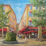 J’ai utilisé à la fois le pinceau et le couteau pour rendre la lumière, la chaleur des façades, les détails de la scène et l’ambiance vivante. Il y a les parasols rouges, les gens attablés, une petite fontaine, un vélo appuyé contre un arbre, et une fillette qui traverse la place. Tout cela crée une atmosphère joyeuse et authentique, comme une pause dans le temps. J’ai voulu partager ce moment simple mais précieux, à travers ma peinture.