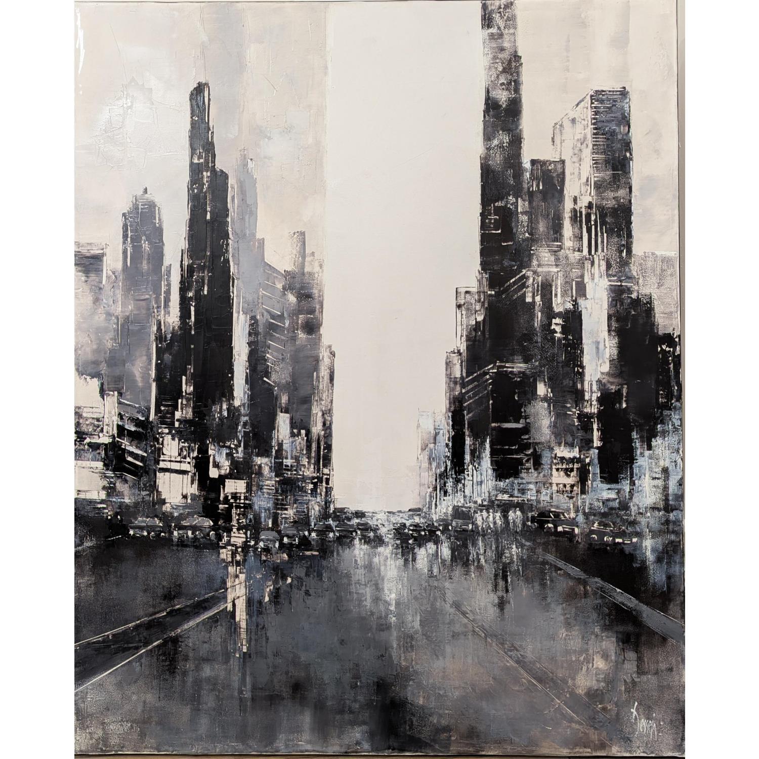 L'artiste a utilisé la technique Huile pour créer cette peinture grand format sur Toile de style Figuratif sur les thèmes Paysages, Urbain.