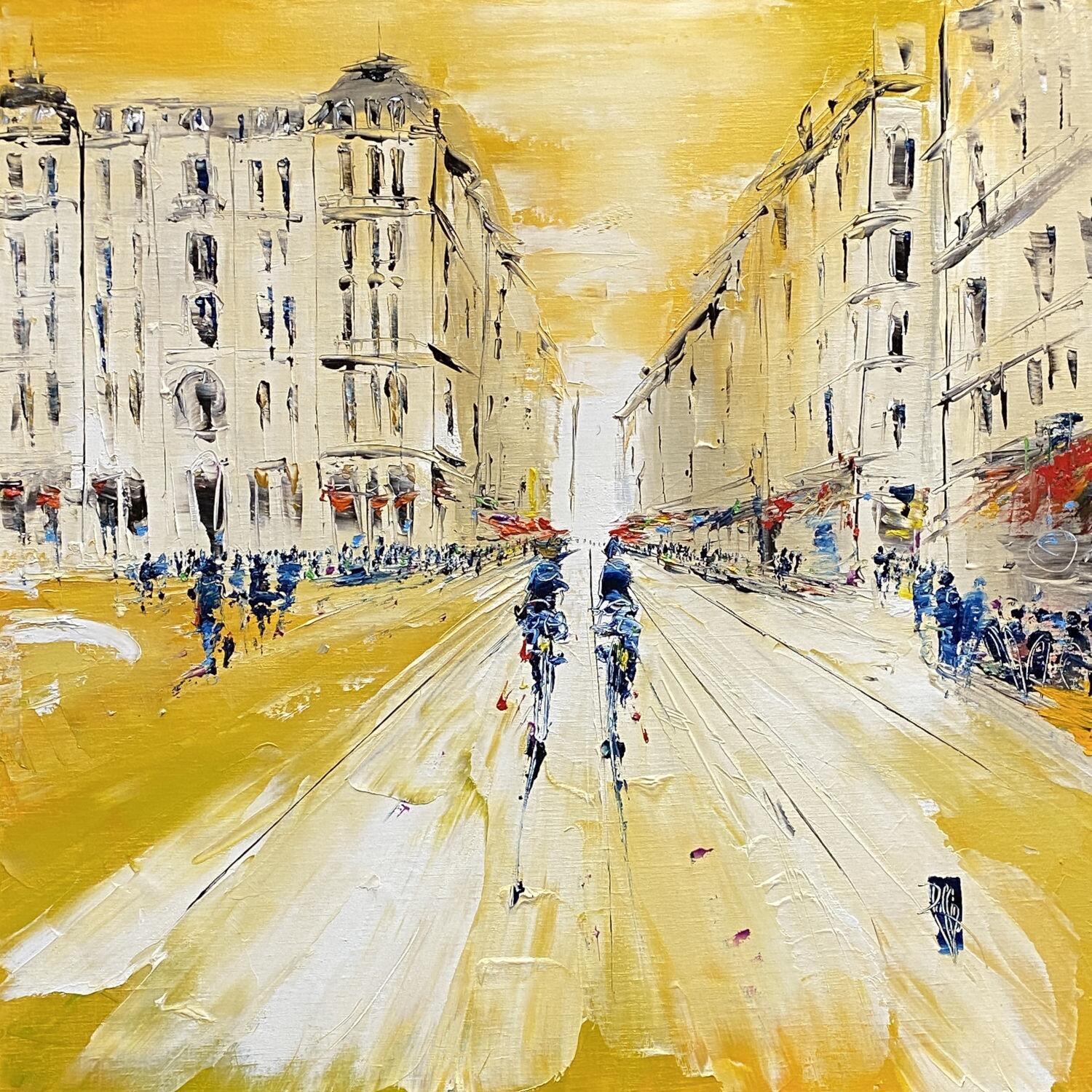 L'artiste a utilisé la technique Huile pour créer cette peinture grand format sur Toile de style Figuratif sur le thème Urbain.