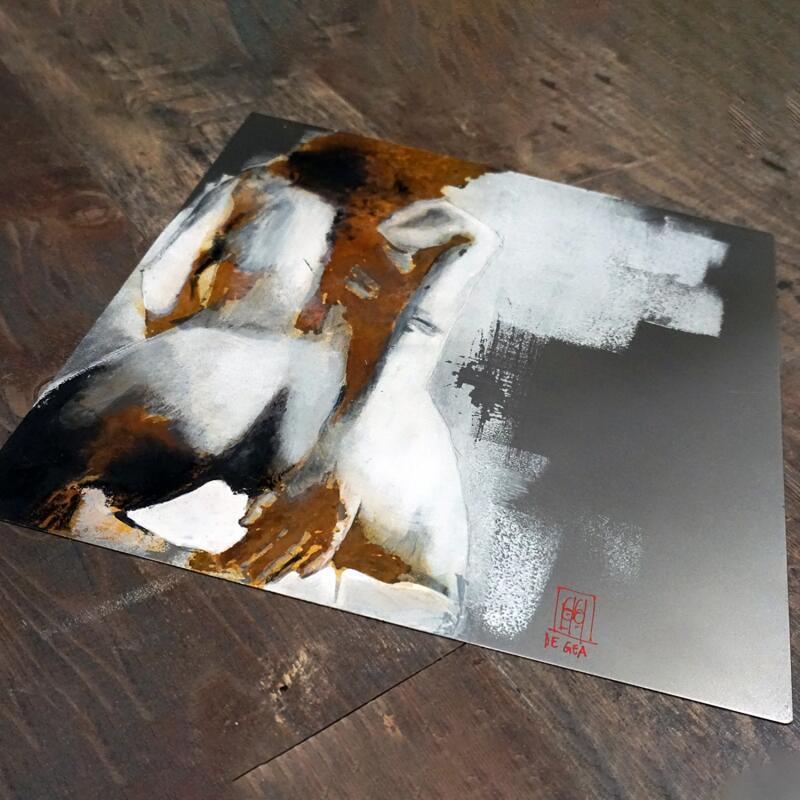 L'artiste a utilisé une technique unique, basée sur l'utilisation de l'oxydation du fer, c'est à dire la rouille, pour créer cette peinture petit format au style singulier.