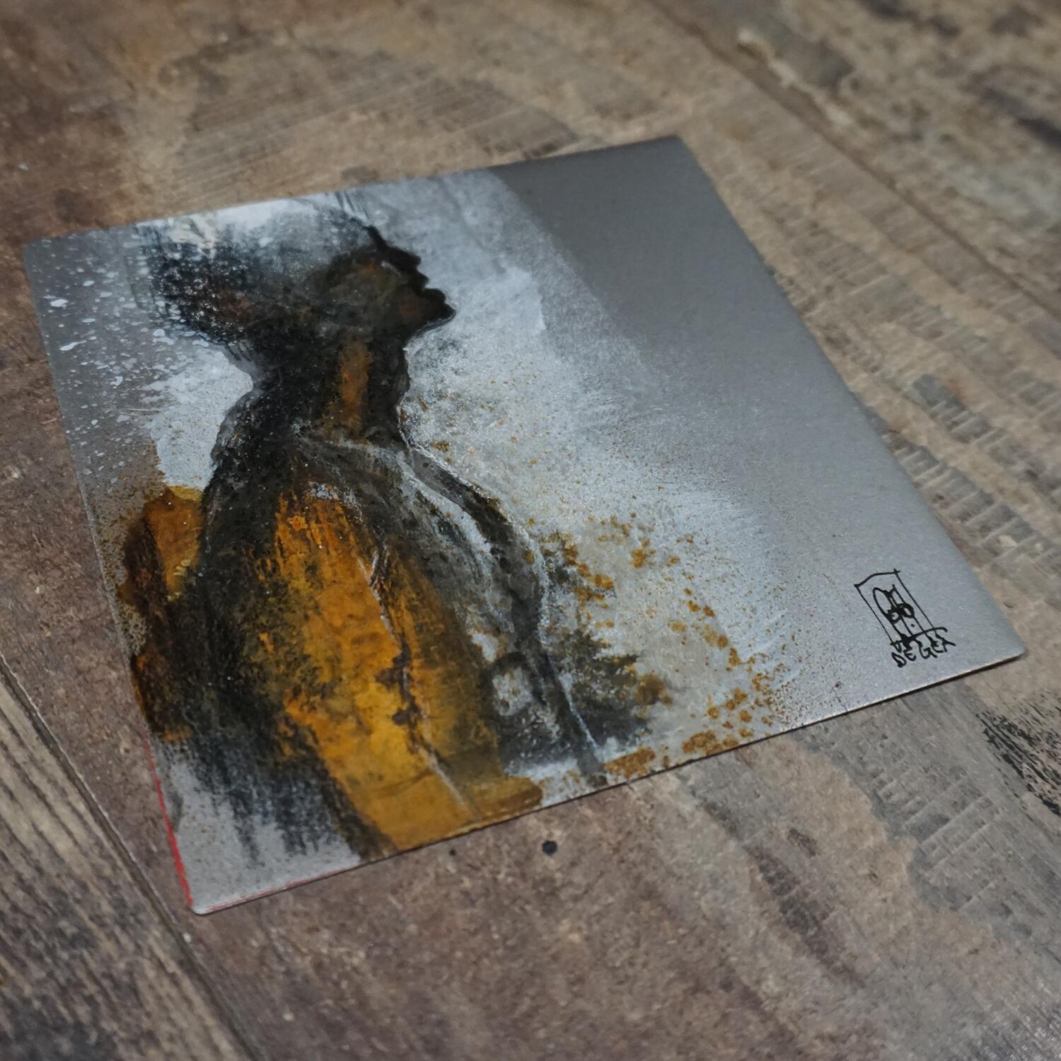L'artiste a utilisé différentes techniques pour créer cette peinture petit format au style singulier.