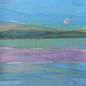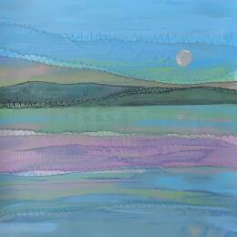L'artiste a utilisé de l'acrylique, des collants de récupération et du fil pour esquisser ce paysage de plaines aux forêts et aux montagnes lointaines et où la lune se reflète sur une calme étendue d'eau.